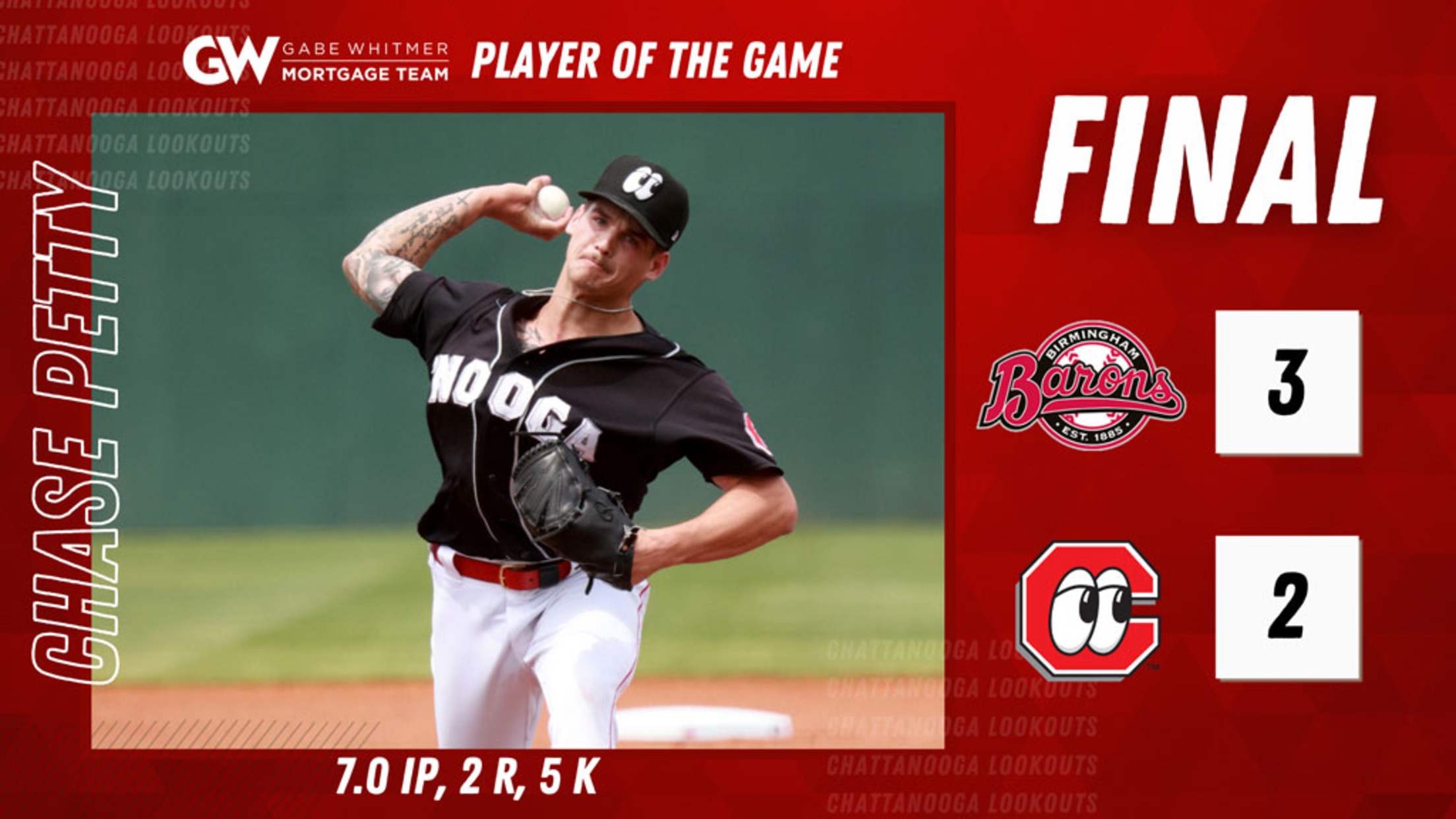 Chattanooga Lookouts pitcher Chase Petty threw seven strong innings, but the Lookouts fell 3-2 in 10 innings to the Birmingham Barons. For the second consecutive home start, Petty only allowed two runs in seven innings. The right-hander finished with five strikeouts to bring his team-high total to 108. Birmingham took