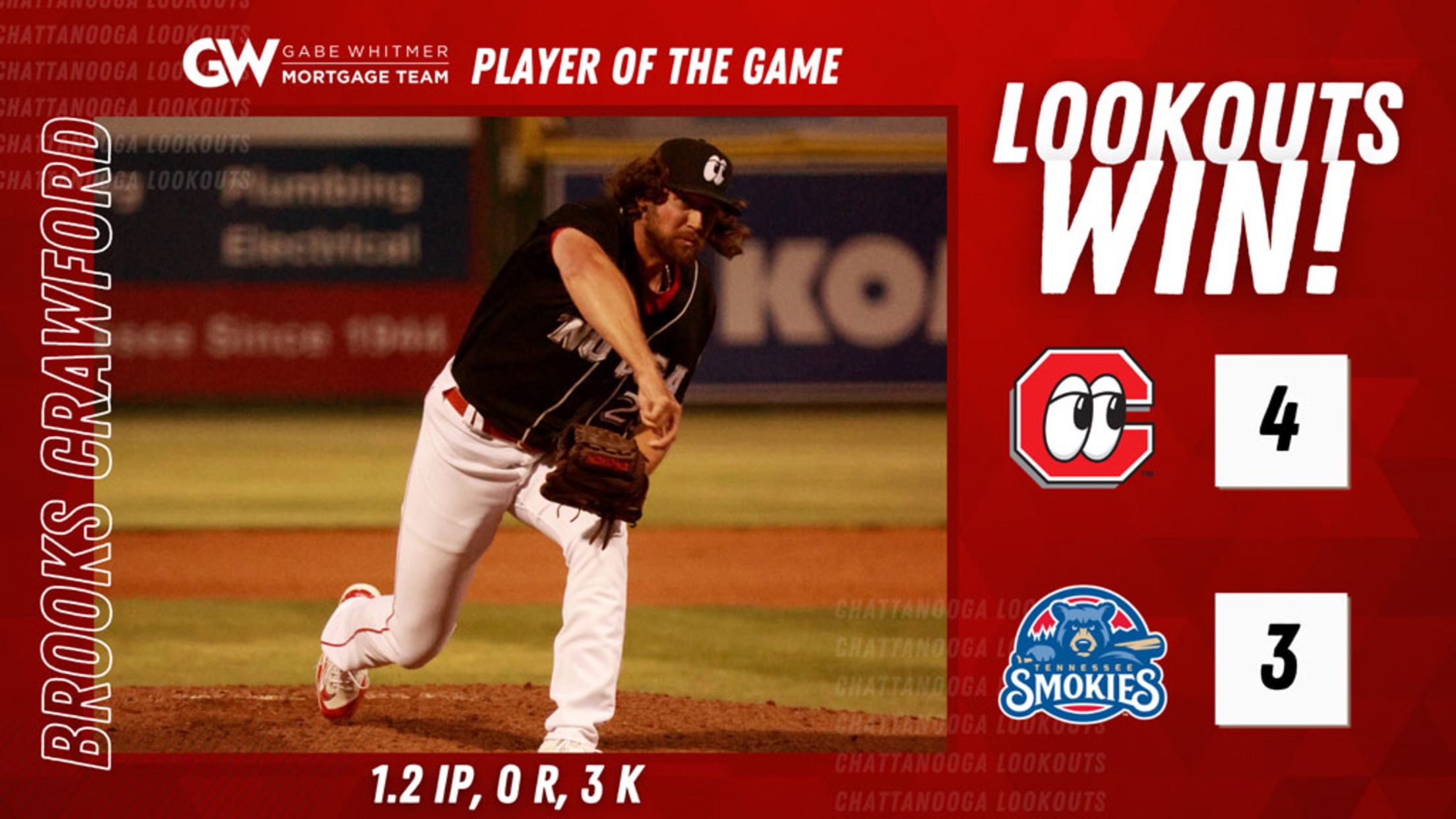 The Chattanooga Lookouts snapped their five-game losing streak with a 4-3 win over the Tennessee Smokies. Starting pitcher Kevin Abel delivered a strong start, only allowing three runs in 6.1 innings. Tonight, the Smokies struck first on a James Triantos RBI double down the line. Chattanooga answered resoundingly in the