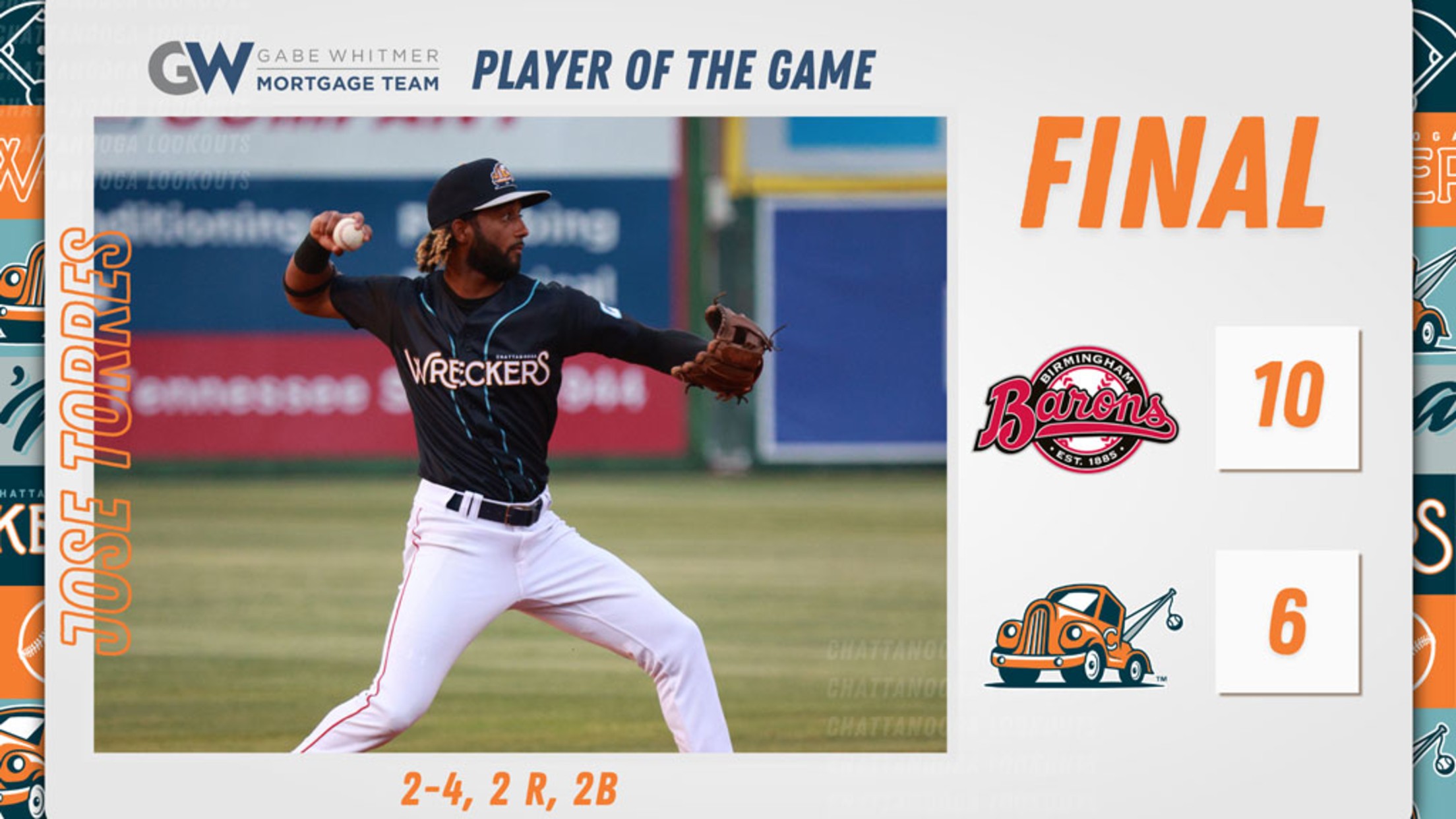 In the loss the Lookouts totaled 10 hits, but could not keep up with Birmingham. On the pitching side, Andrew Moore and Donovan Benoit combined to throw 4.1 scoreless innings.