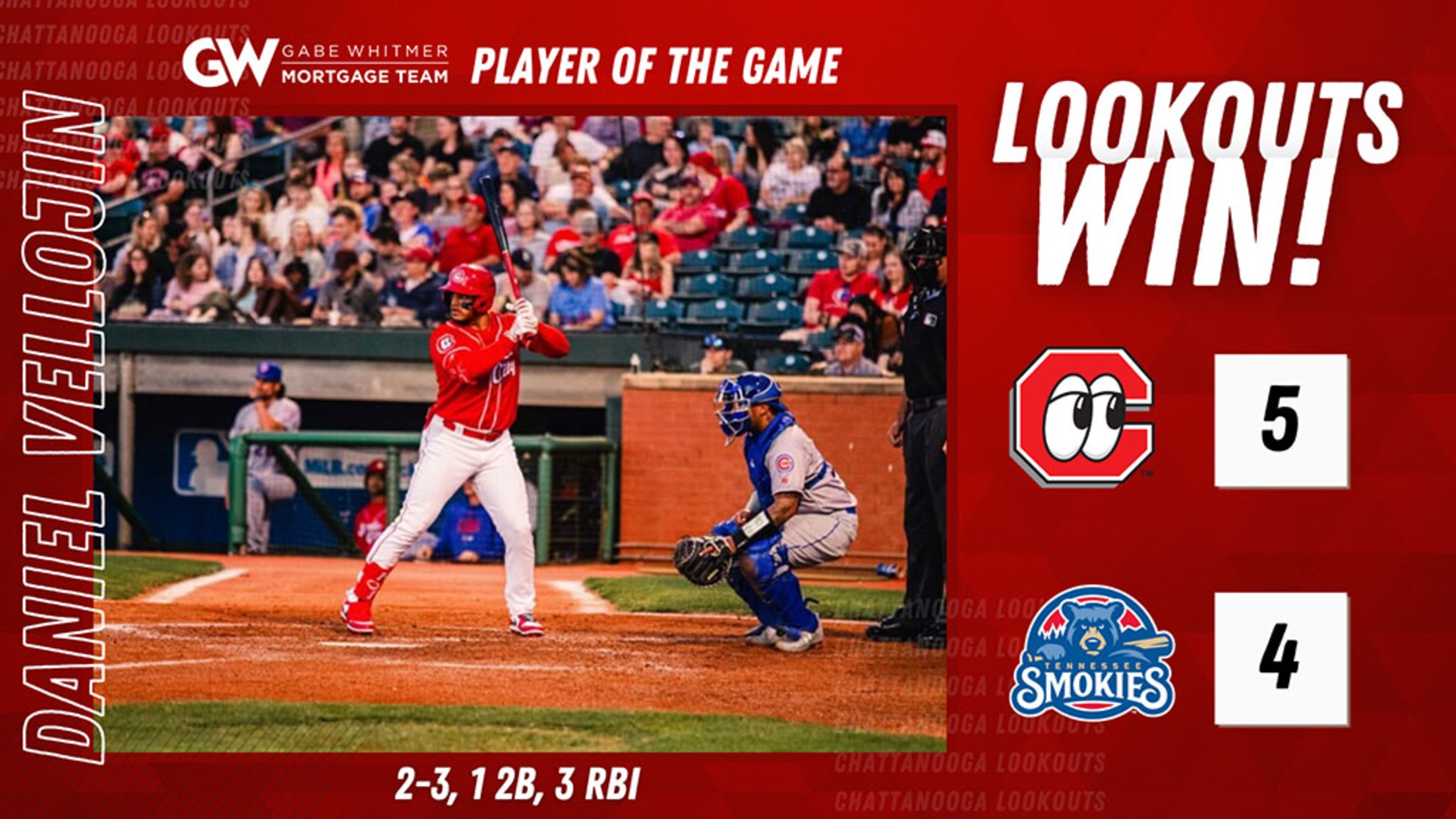 During the second game, the team got out to another early lead. Tied 1-1 in the fourth, Daniel Vellojin smacked a bases-clearing double to break the tie and make it 4-1 Lookouts. Chattanooga was en route to a win in the seventh, but Tennessee tied it up with three runs. In extra-innings, Nick Northcut singled home Allan Cerda to deliver the win.