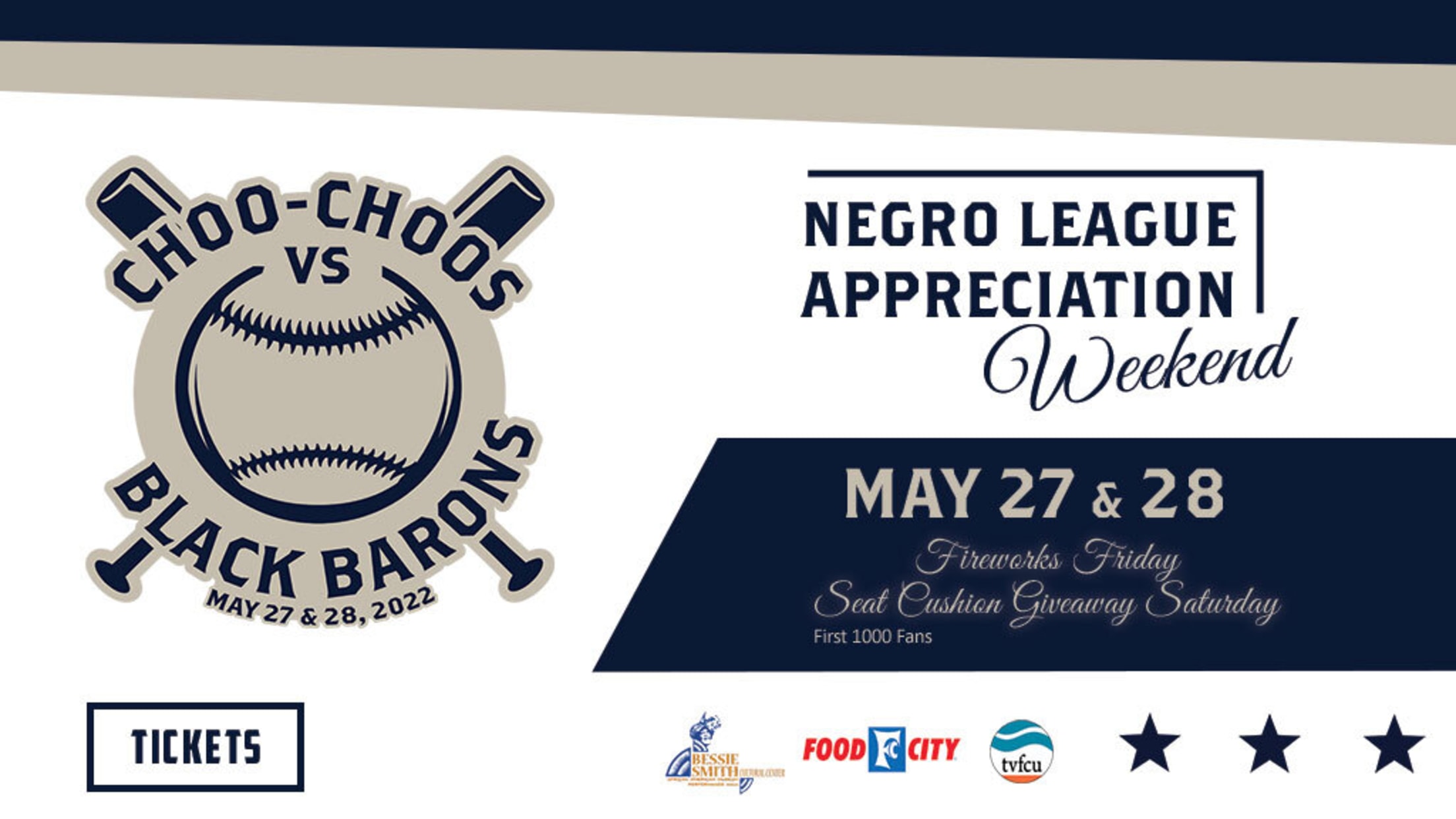 CHATTANOOGA, Tenn. – The Chattanooga Lookouts will take the field as the Chattanooga Choo-Choos and play against the Birmingham Black Barons during Negro League Appreciation Weekend at AT&T Field, sponsored by the Bessie Smith Cultural Center in partnership with Food City and TVFCU.