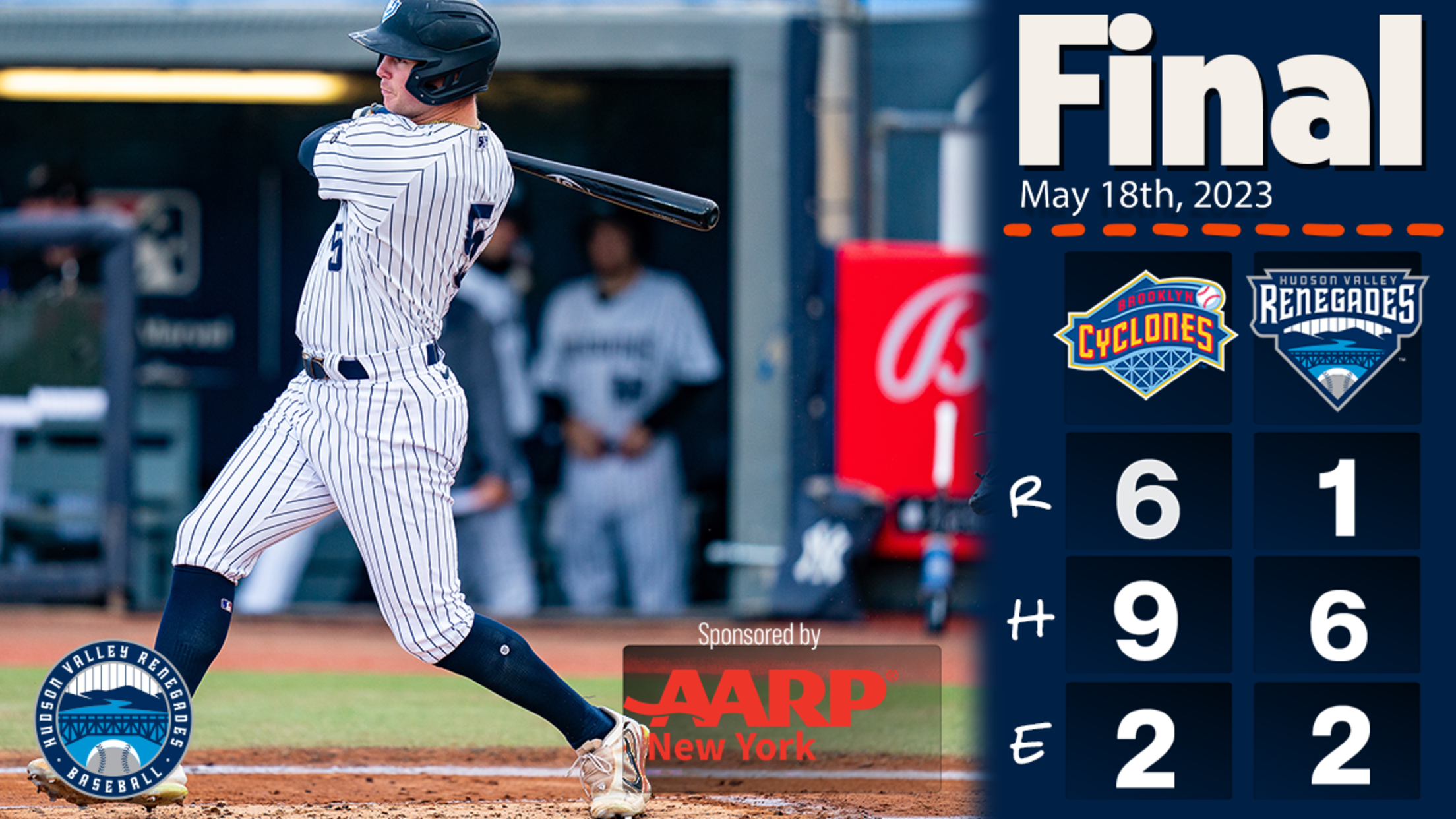 WAPPINGERS FALLS, N.Y. (May 18, 2023) — A sixth-inning grand slam by the Brooklyn Cyclones sunk the Hudson Valley Renegades 6-1 on Thursday evening at Heritage Financial Park. Brooklyn struck right away in the first inning with a pair of runs on an RBI double from Alex Ramirez, and a