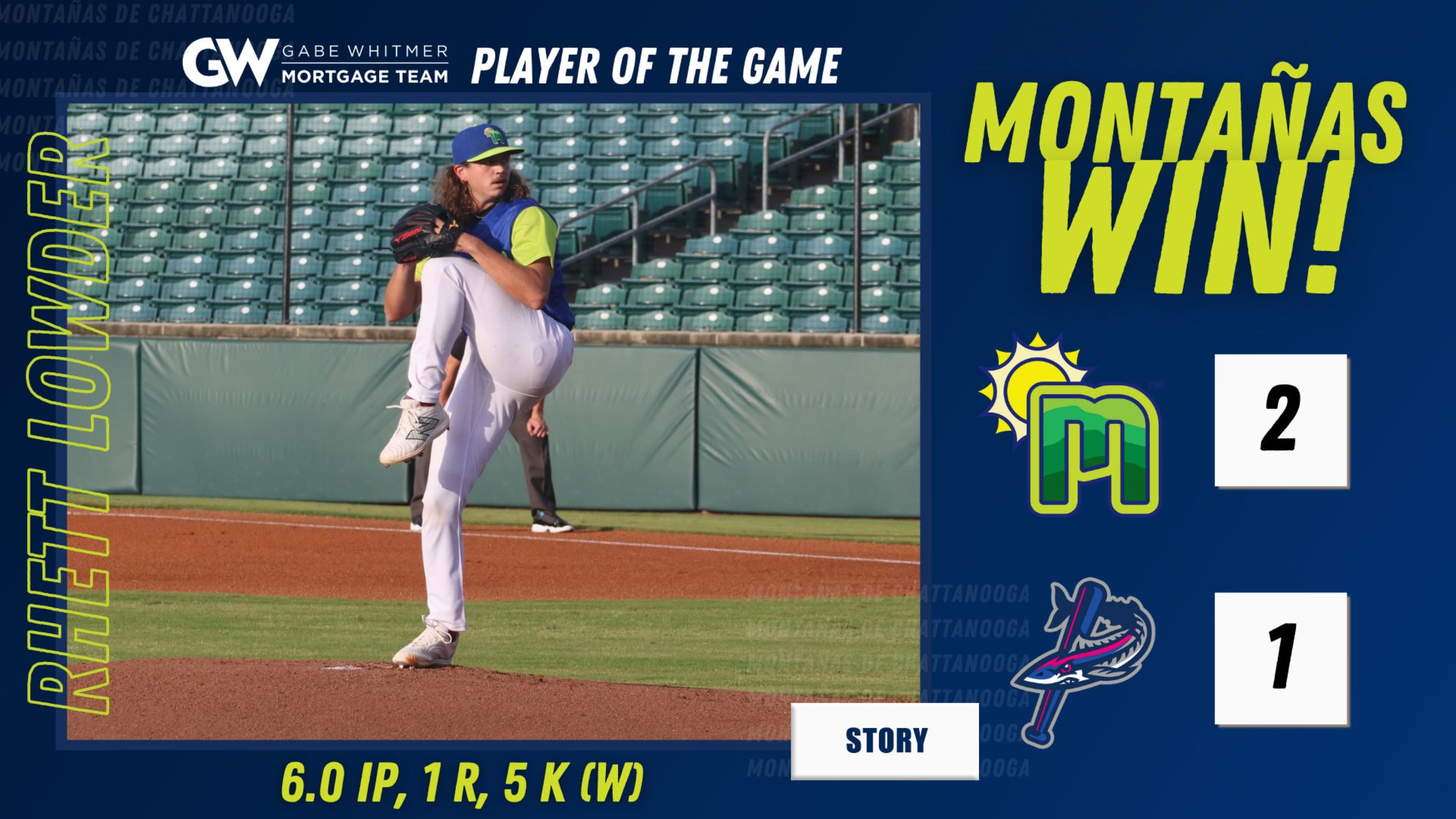 Las Montañas de Chattanooga defeated the Pensacola Blue Wahoos, 2-1. Starting pitcher Rhett Lowder continued his red-hot summer, only allowing one hit in six innings with five strikeouts. In five starts after the All-Star break, the right-hander is 3-0 with a 2.30 ERA and 27 strikeouts in 31.1 innings.