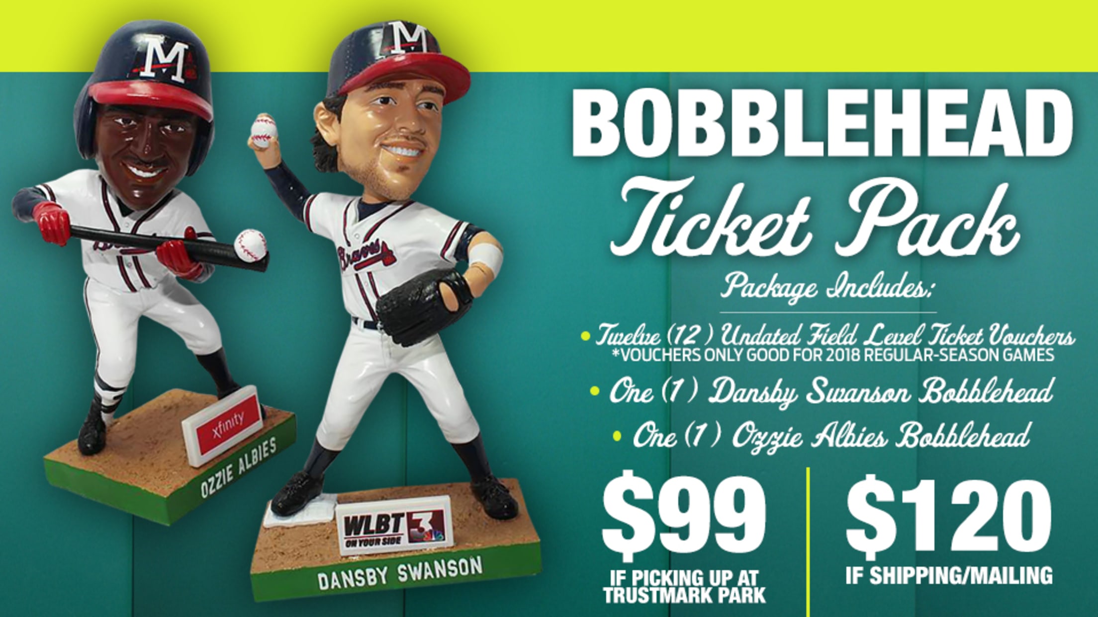 The Bobblehead Ticket Pack features 12 undated Field Level ticket vouchers good for any 2018 Mississippi Braves regular-season home game. Each package includes one (1)