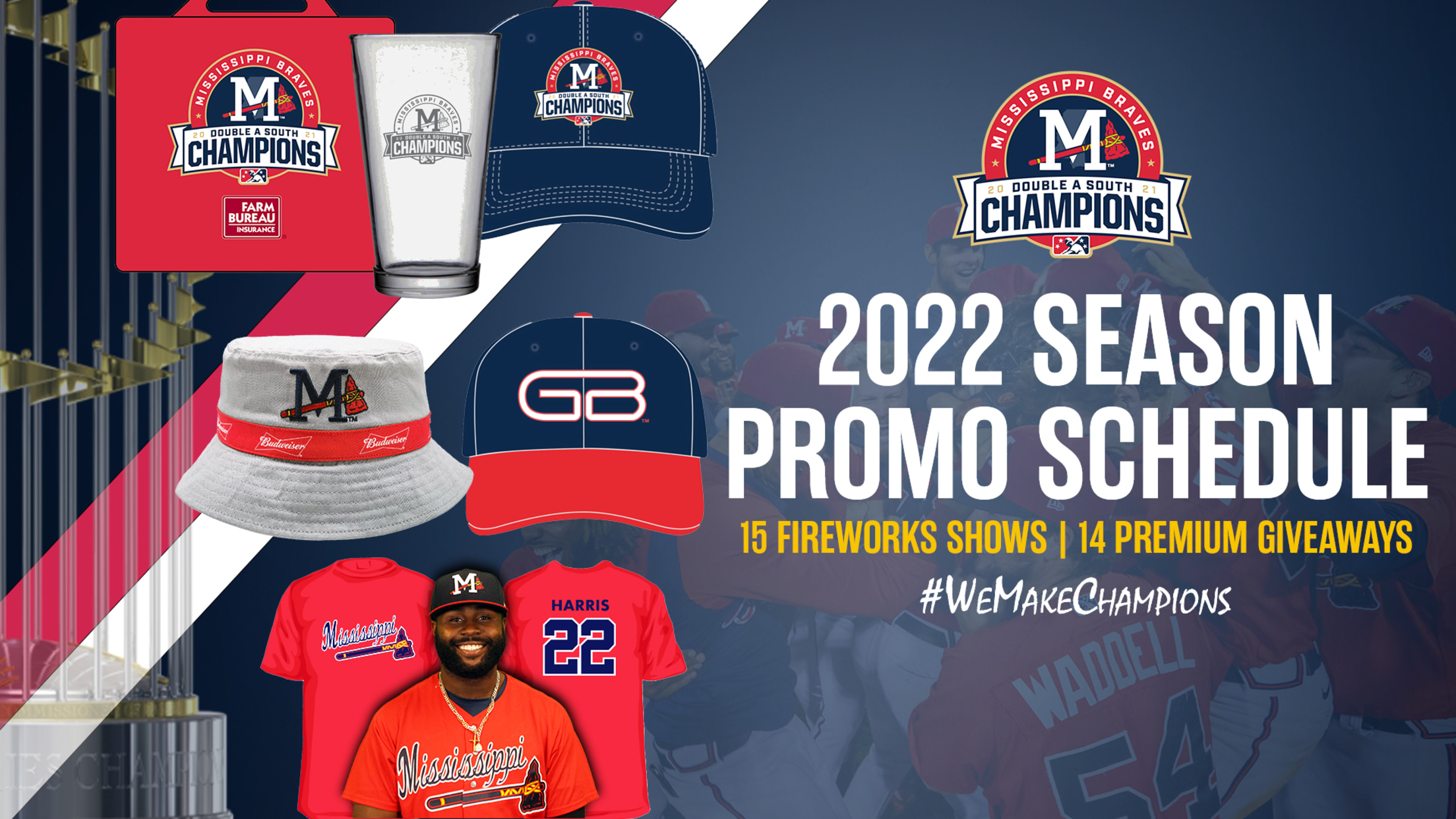 PEARL - The 2021 Double-A South Champion Mississippi Braves are excited to announce the preliminary promotional schedule for the 2022 season. Fans attending games at Trustmark Park will be treated to four giveaway items commemorating the 2021 Championship season, numerous theme nights, giveaways, and 15 Fireworks Shows throughout the 69-game home schedule in the team's 17th season.