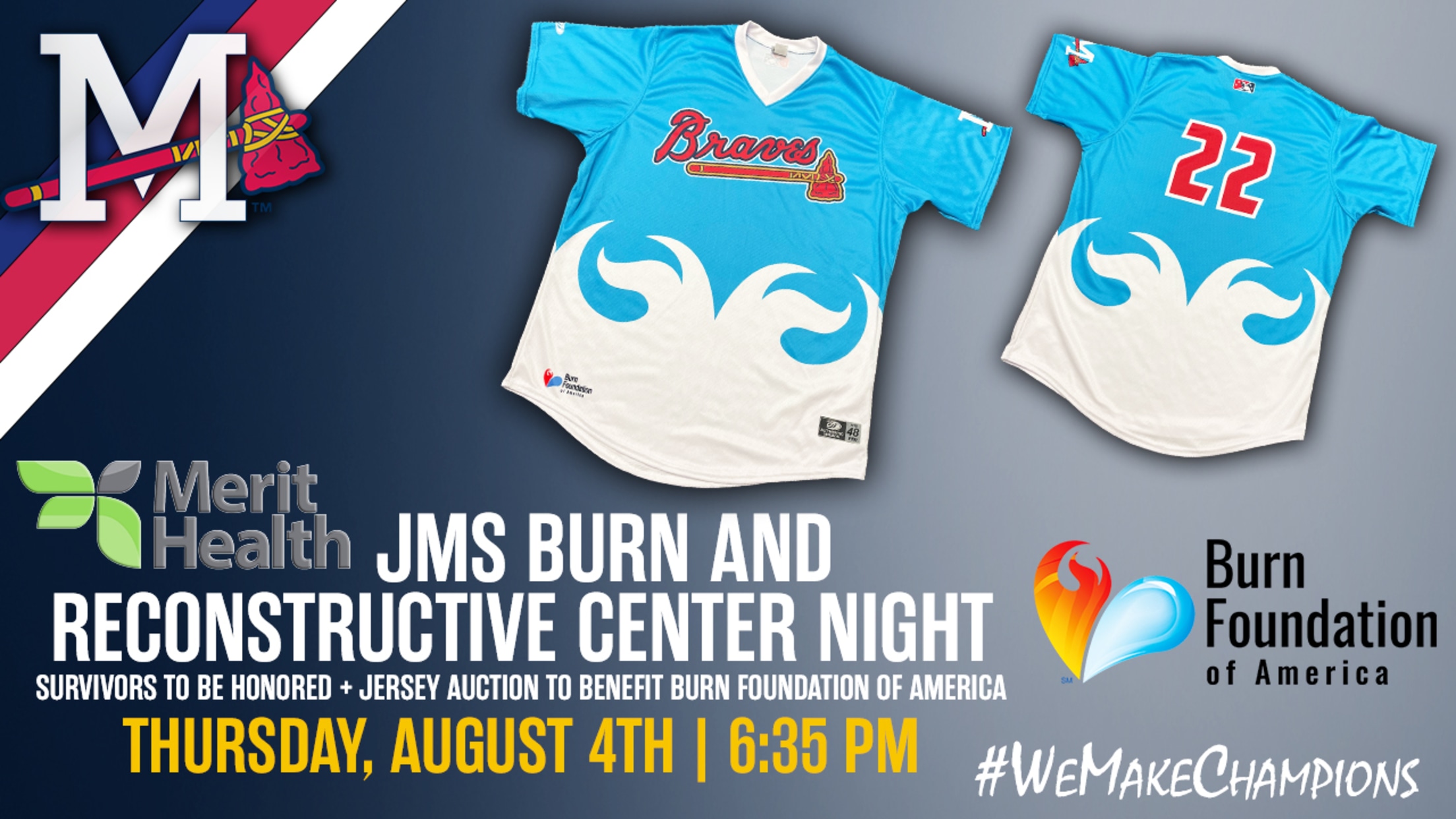 Burn survivors from across the state of Mississippi will be recognized pre-game, and M-Braves players and coaches will be wearing special jerseys designed by Tyler Designs, with a unique design based on the Burn Foundation of America’s “Flame and Water” logo. These jerseys will be available to fans via silent auction during the game, with proceeds benefitting the Burn Foundation of America.