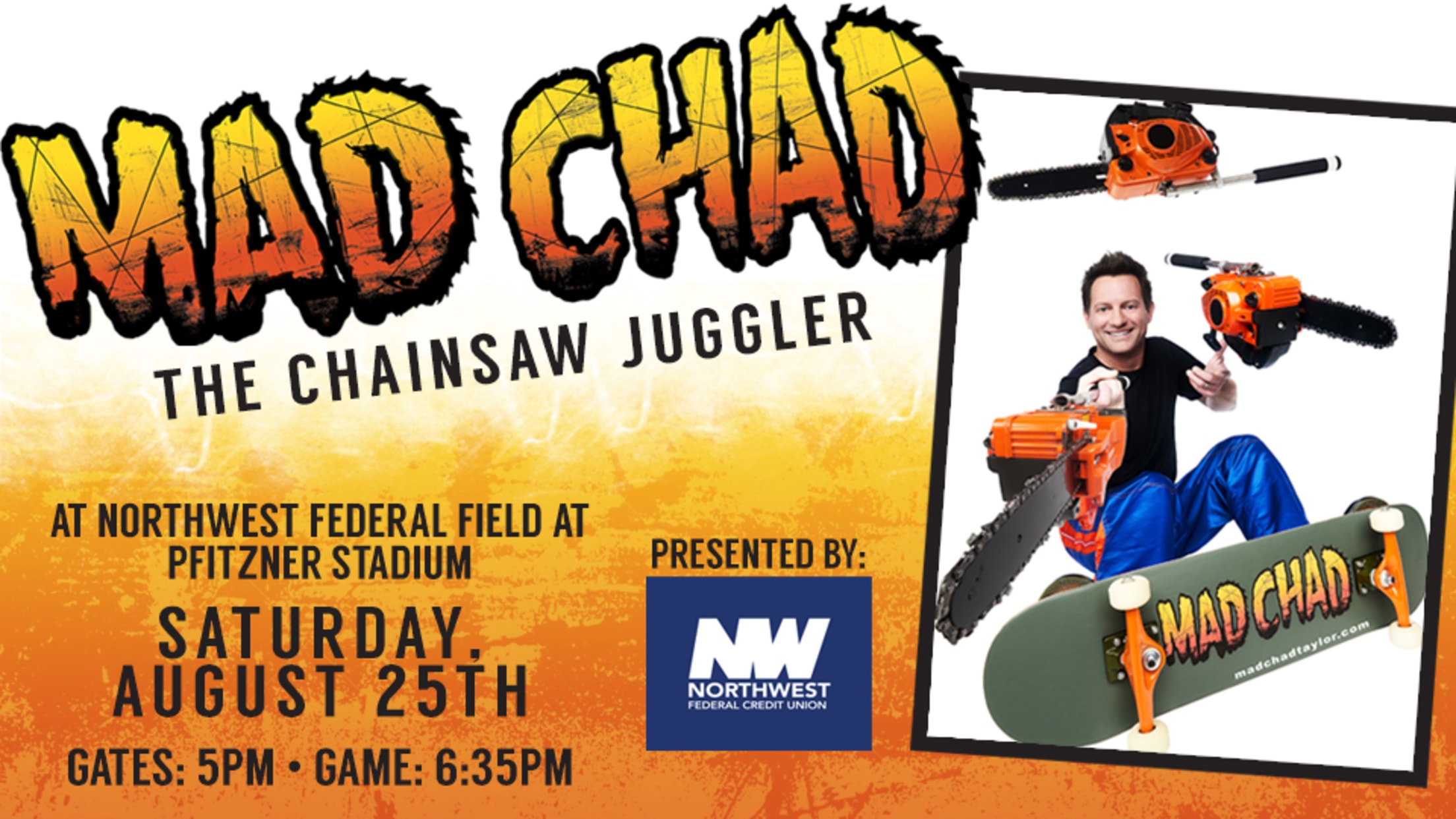 Woodbridge, VA---The Potomac Nationals are excited to announce that Mad Chad Taylor will make an appearance at Northwest Federal Field at Pfitzner Stadium on Saturday, August 25th. Taylor's appearance, presented by Northwest Federal Credit Union, joins a night with The P-Nats that already features a Tanner Roark & American Eagle Team USA Championship Clinch bobblehead giveaway for the first 1,250 fans, presented by Loyal Hygiene Solutions. The game is the second of a three-game series against the Lynchburg Hillcats (Cleveland Indians).