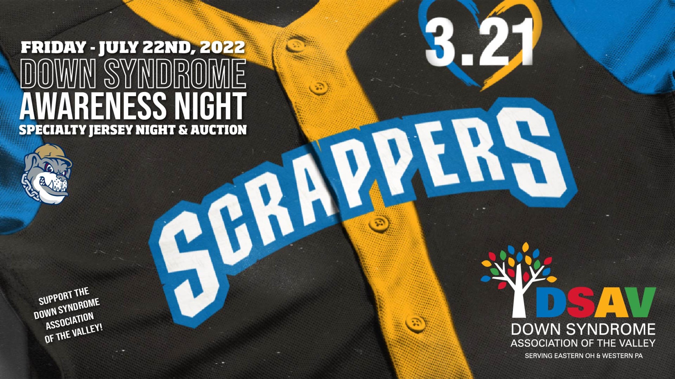 NILES, OH - The Mahoning Valley Scrappers are excited to unveil the first of a series of five specialty jersey nights during the 2022 season. The Scrappers have partnered with the Down Syndrome Association of the Valley to create a specialty jersey that the Scrappers players will wear for Down Syndrome Awareness Night on Friday, July 22nd against the State College Spikes. Game worn jerseys will be auctioned off in person at the game and also online at mvscrappers.com and LiveSource. Jersey proceeds will benefit the Down Syndrome Association of the Valley.