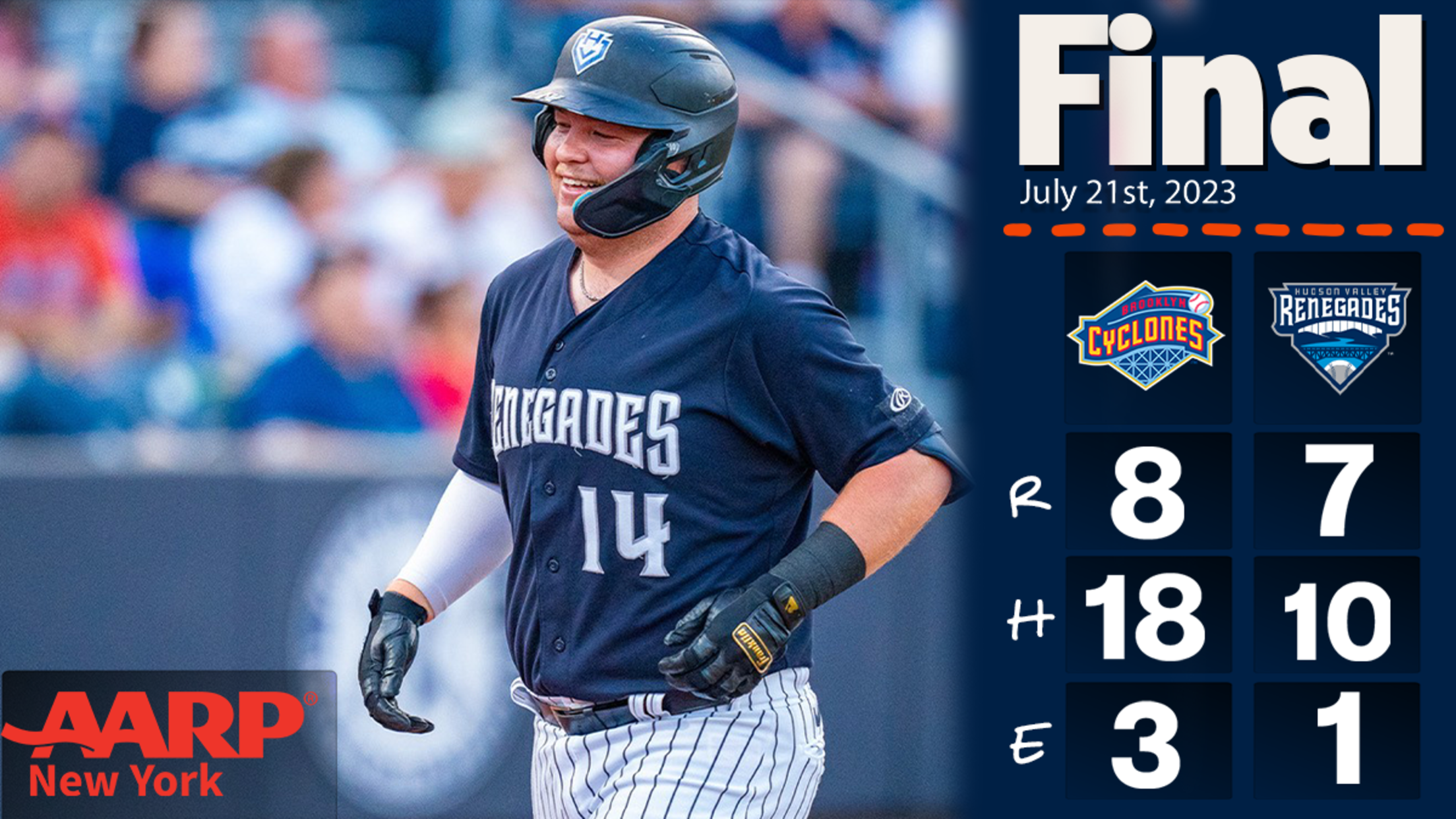 WAPPINGERS FALLS, N.Y. (July 21, 2023) — The Hudson Valley Renegades and Brooklyn Cyclones exchanged leads late, but the Cyclones outlasted the Renegades 8-7 on Friday night at Heritage Financial Park.