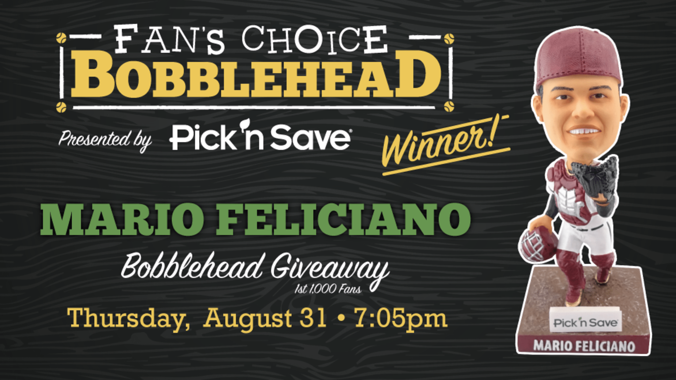 GRAND CHUTE, WI - Wisconsin Timber Rattlers fans have spoken. They have picked catcher Mario Feliciano as the Fans' Choice Bobblehead presented by Pick 'n Save that will be given away on Thursday, August 31.
