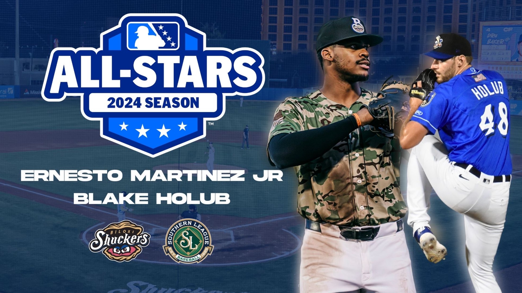 BILOXI, MS – Minor League Baseball announced today that Biloxi Shuckers first-baseman Ernesto Martinez Jr. and reliever Blake Holub were named 2024 Southern League All-Stars. It marks the fifth time in franchise history that multiple Shuckers were named to the post-season All-Star team and the second consecutive season after a