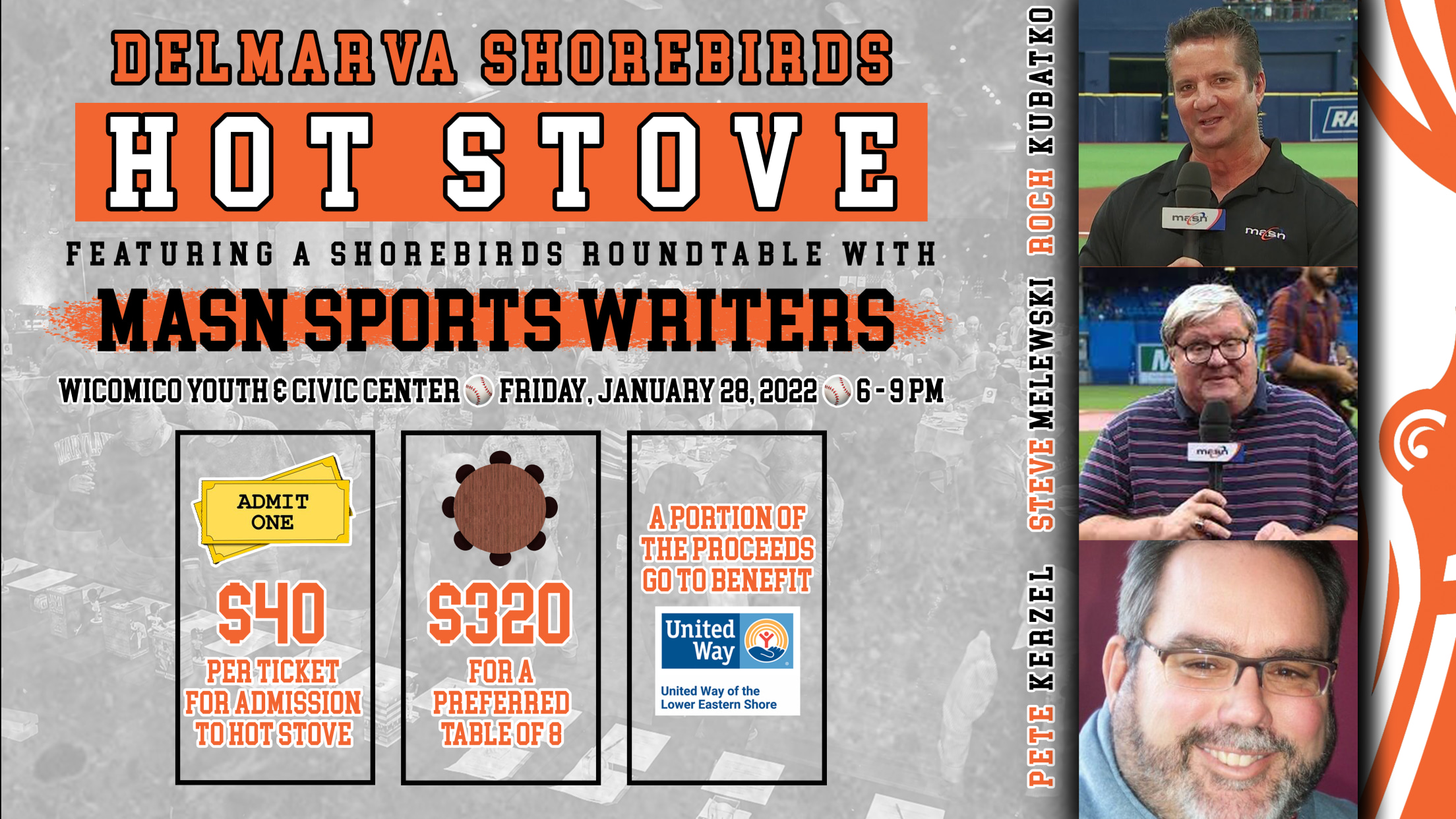 SALISBURY, MD - MASN sports writers Roch Kubatko, Steve Melewski, and Pete Kerzel will serve as featured members of the Shorebirds roundtable at the Delmarva Shorebirds’ 20th annual Hot Stove Banquet, set to be held at the Wicomico Youth and Civic Center in Salisbury on Friday, January 28, from 6:00-9:00 p.m.