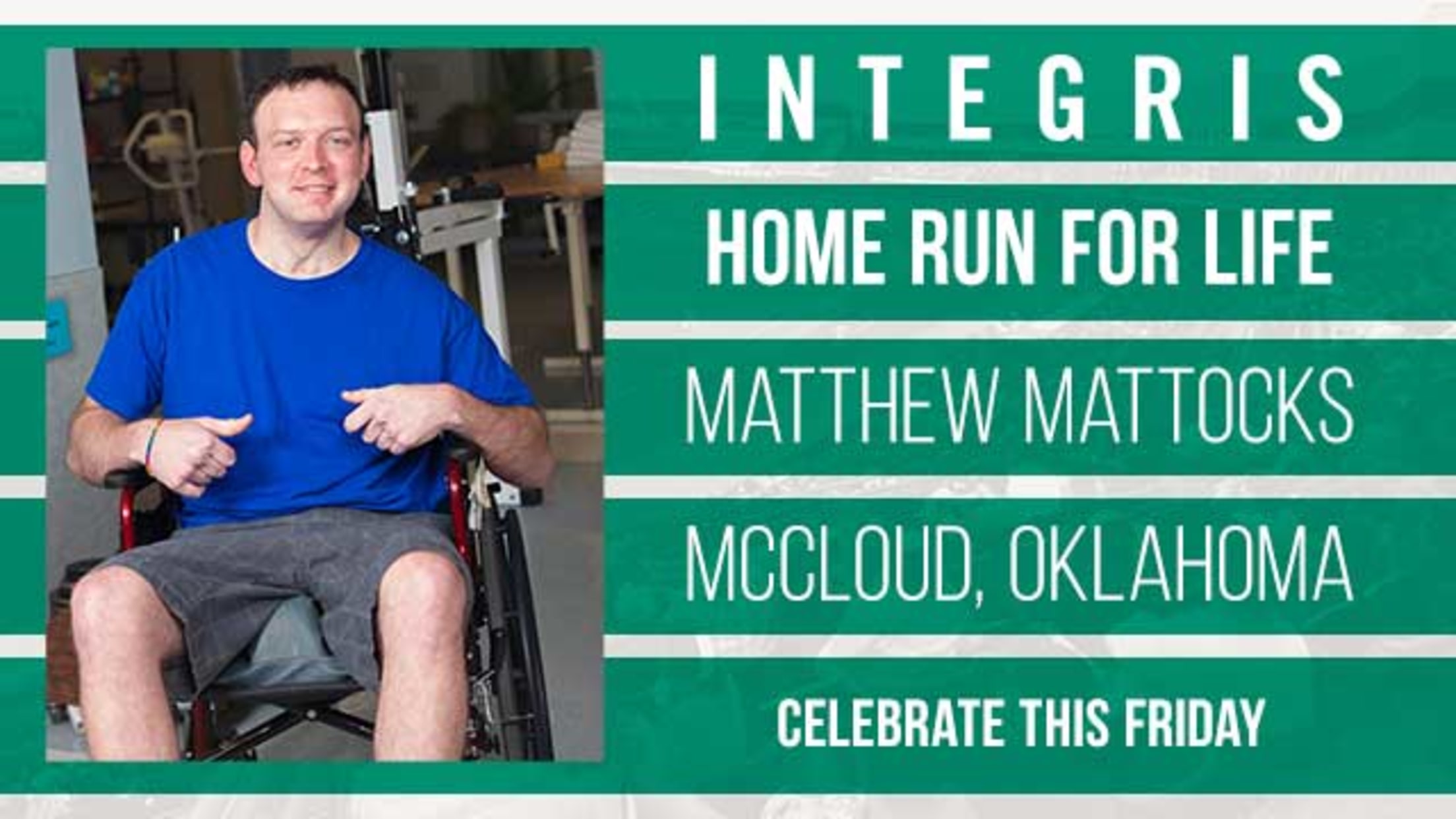 OKLAHOMA CITY - The Oklahoma City Dodgers and INTEGRIS continue the 2018 "Home Run For Life" series Friday at Chickasaw Bricktown Ballpark by recognizing Matthew Mattocks, who suffered a massive brain stem stroke and a rare neurological disorder called locked-in syndrome at age 29.