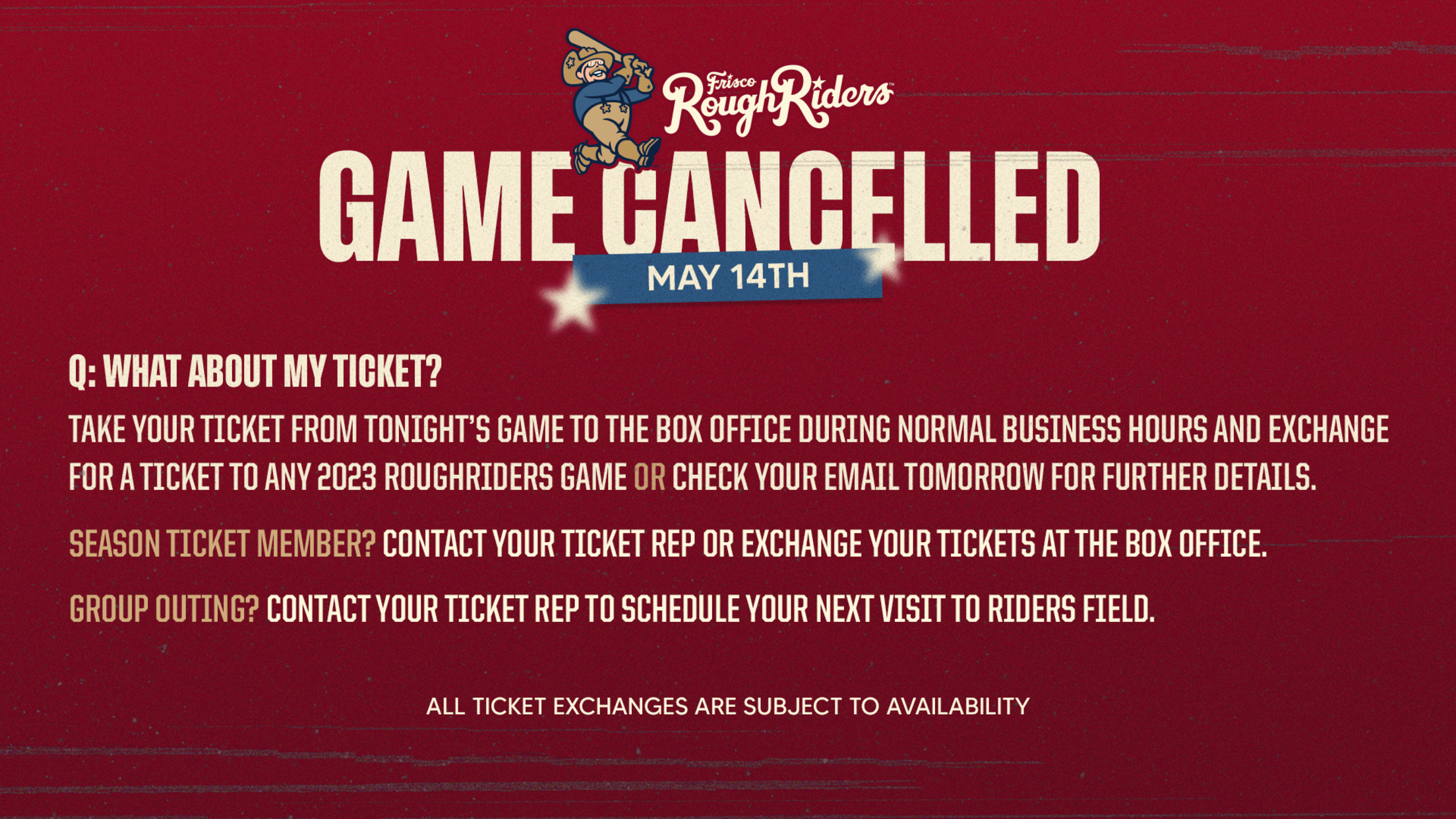 FRISCO, Texas (May 14, 2023) - Sunday's game between the Frisco RoughRiders and Wichita Wind Surge has been cancelled due to rain. Fans who had a ticket to Sunday's game will receive an email with further information. A ticket to Sunday's game can also be exchanged at the Riders Field