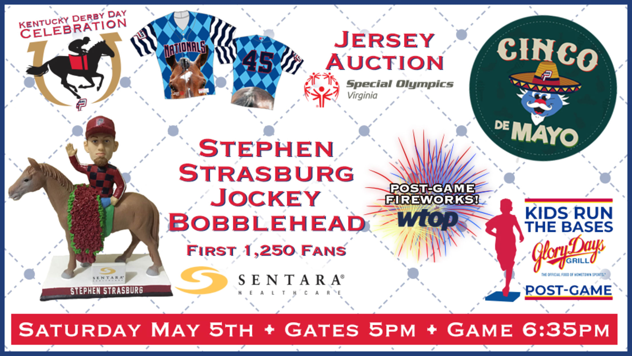 Celebrate the Kentucky Derby and Cinco de Mayo on Saturday, 5/5 at Pfitzner Stadium, Stephen Strasburg Kentucky Derby Day Jockey Bobblehead, Kentucky Derby Day Theme Jerseys, & Much More!
