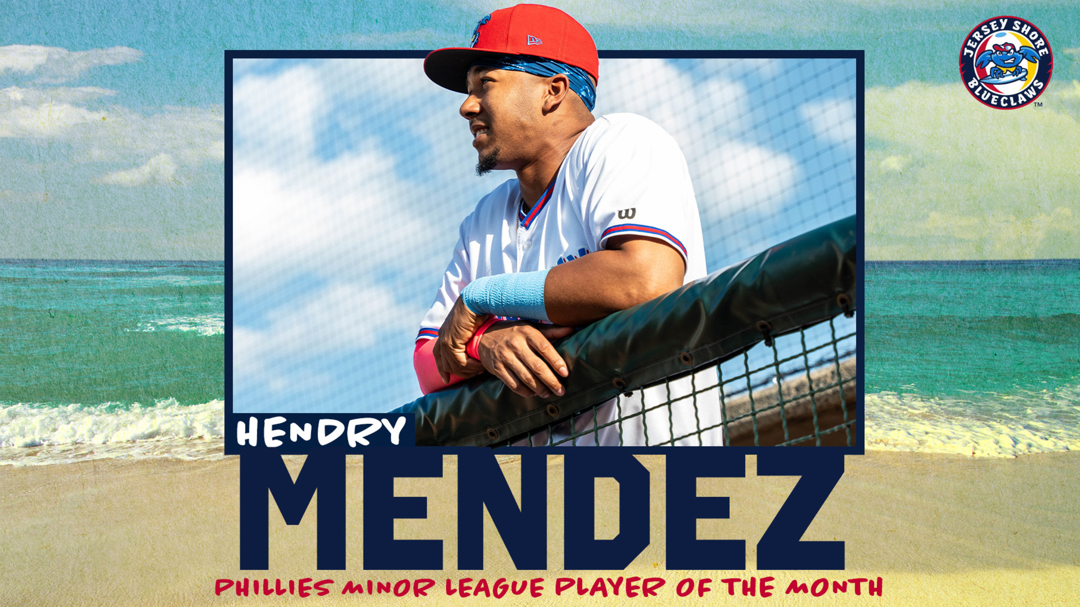 BlueClaws OF Hendry Mendez was named Phillies Minor League Player of the Month for August, it was announced on Thursday by the Phillies.