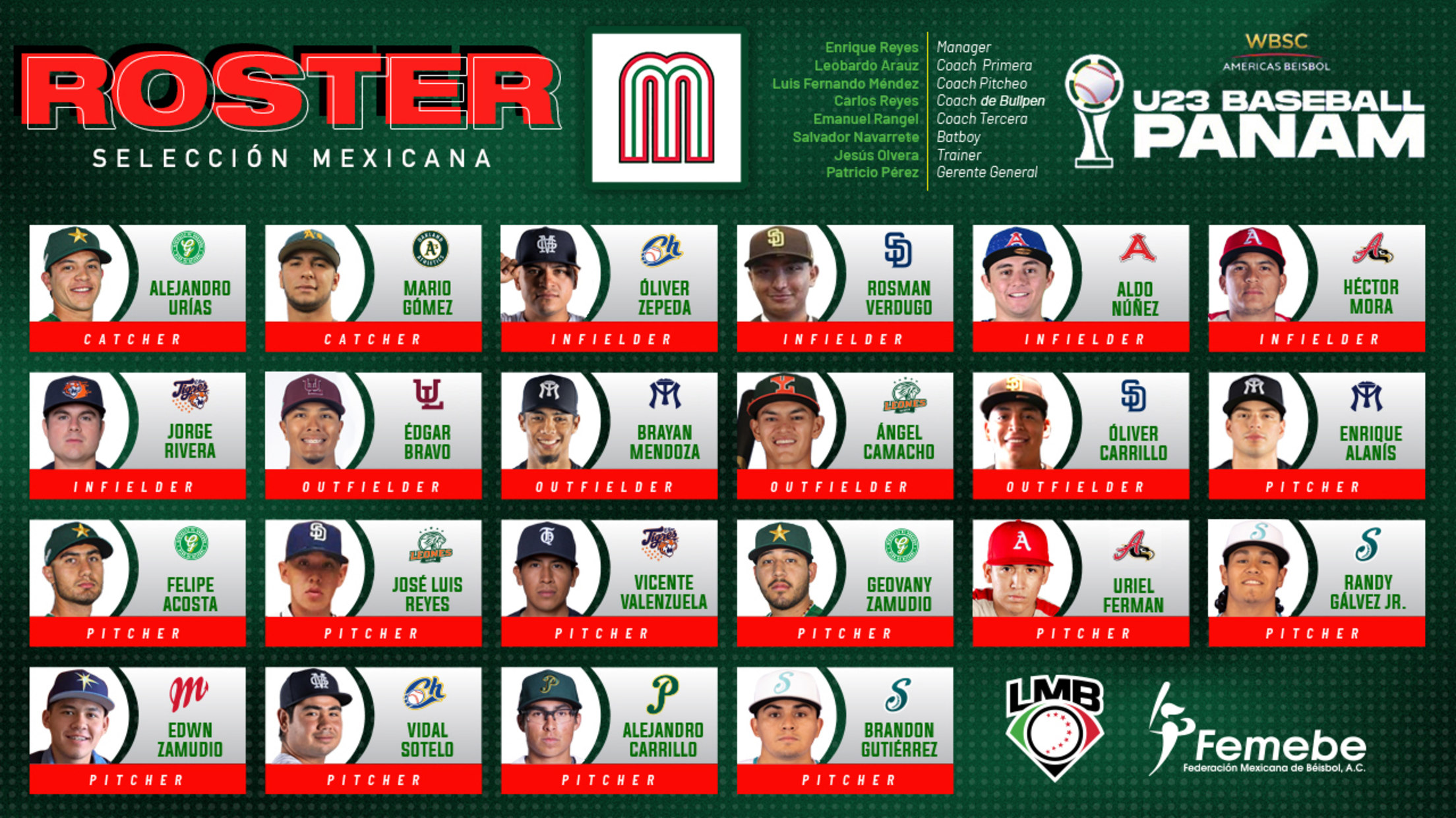 Ciudad de México (www.lmb.com) 18 de noviembre de 2023.- El Comité de Selecciones Nacionales de Beisbol conformado por la Liga Mexicana de Beisbol (LMB) y la Federación Mexicana de Beisbol (FEMEBE) anuncian el roster de la Selección Mexicana de Beisbol para el Premundial U23 Nicaragua 2023. El torneo, del cual