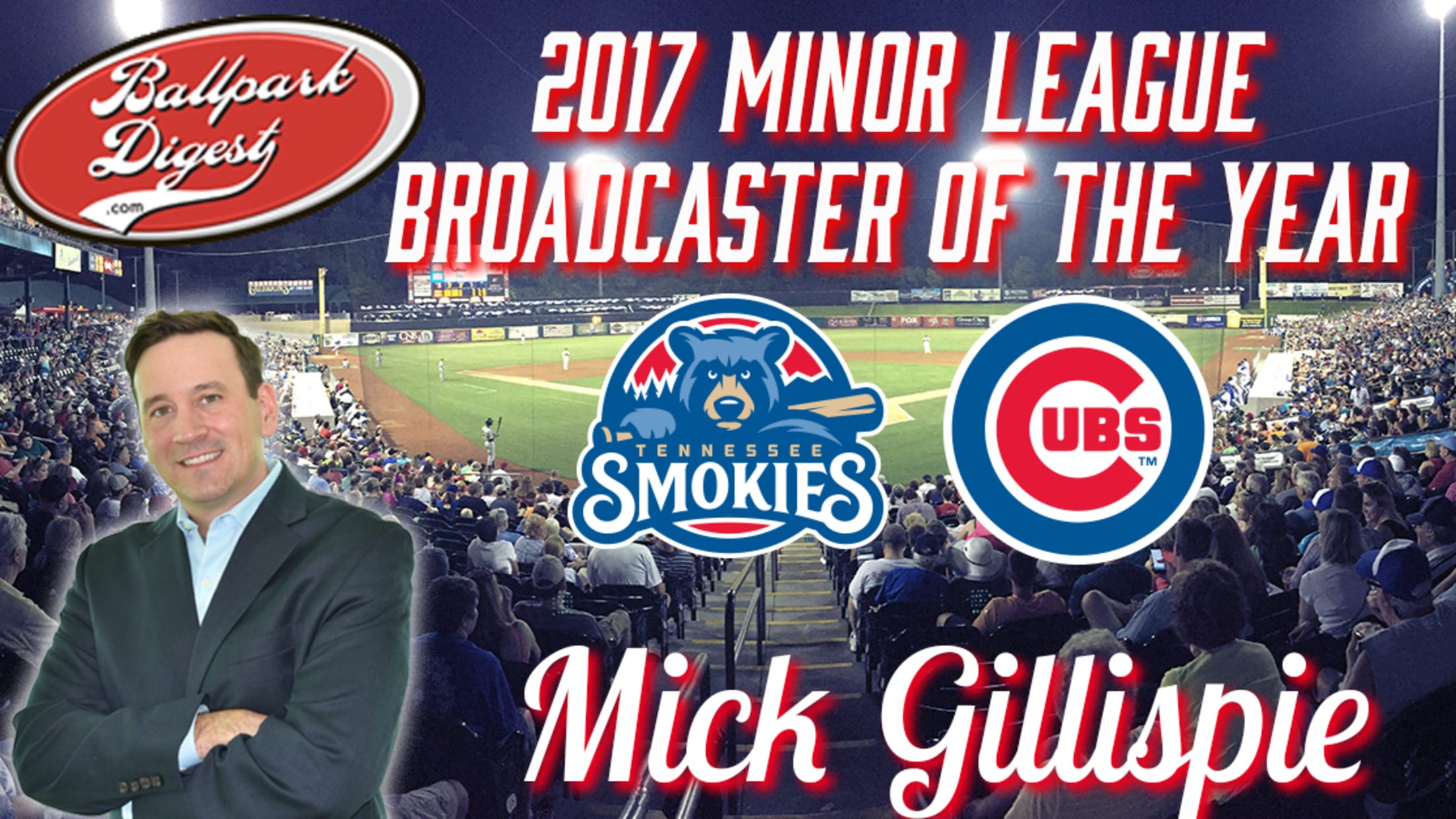SEVIERVILLE, TENNESSEE - Ballpark Digest announced on Monday that Mick Gillispie of the Tennessee Smokies has been named the Minor League Broadcaster of the Year for the 2017 season. Gillispie is the 'Voice of the Smokies' and has assumed the role for 10 years, with his first year as the
