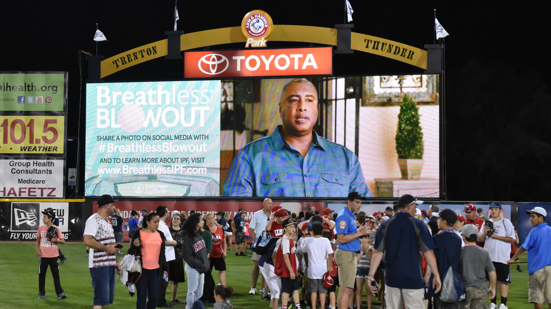 Bernie Williams, Trenton Mascot Boomer encourage fans to blow their best bubble gum bubble.