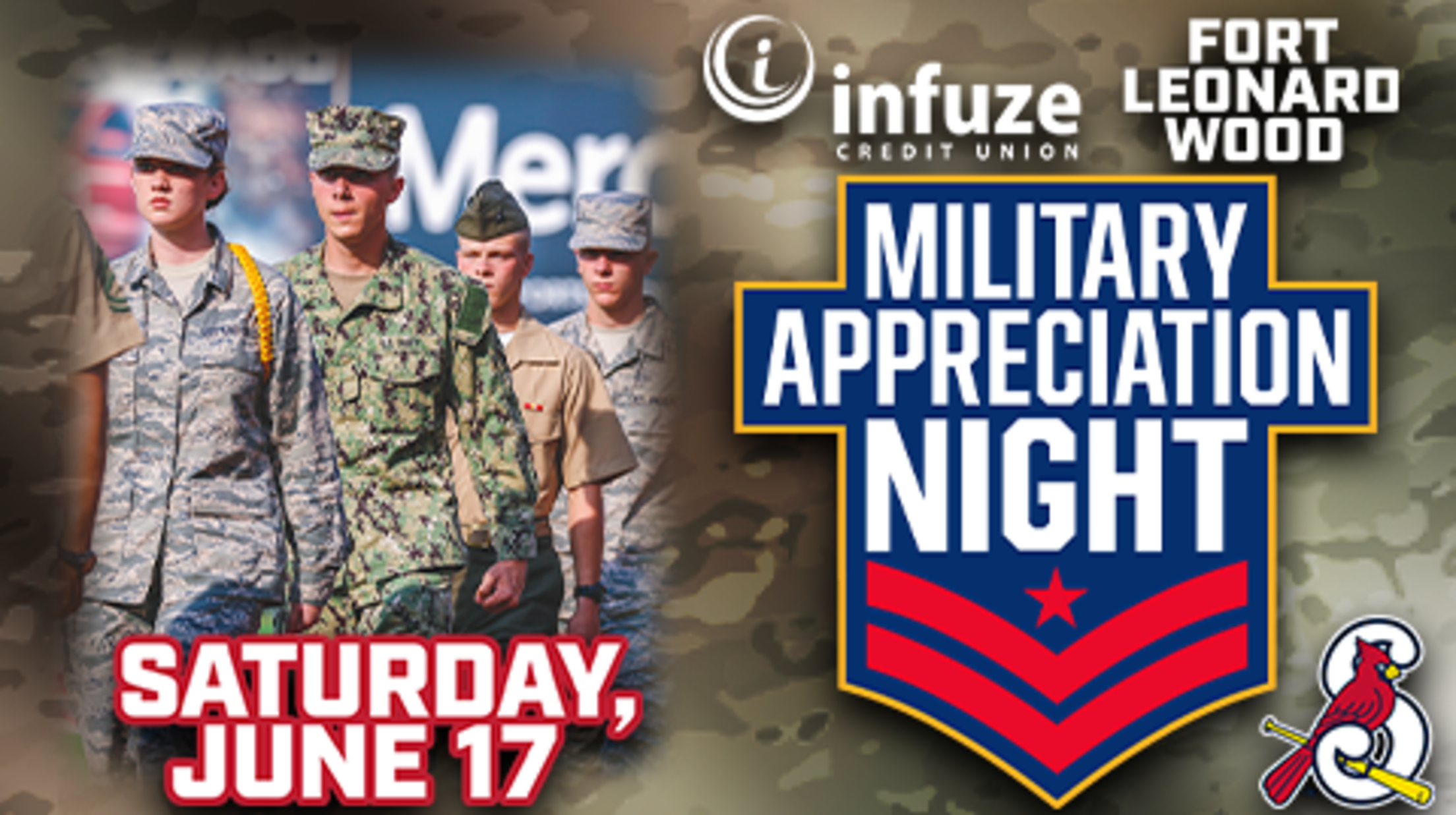 The Springfield Cardinals are proud to honor those who serve our country as we bring back Infuze Credit Union/Fort Leonard Wood Military Appreciation Night and Fireworks Celebration for the 2023 season on Saturday, June 17.