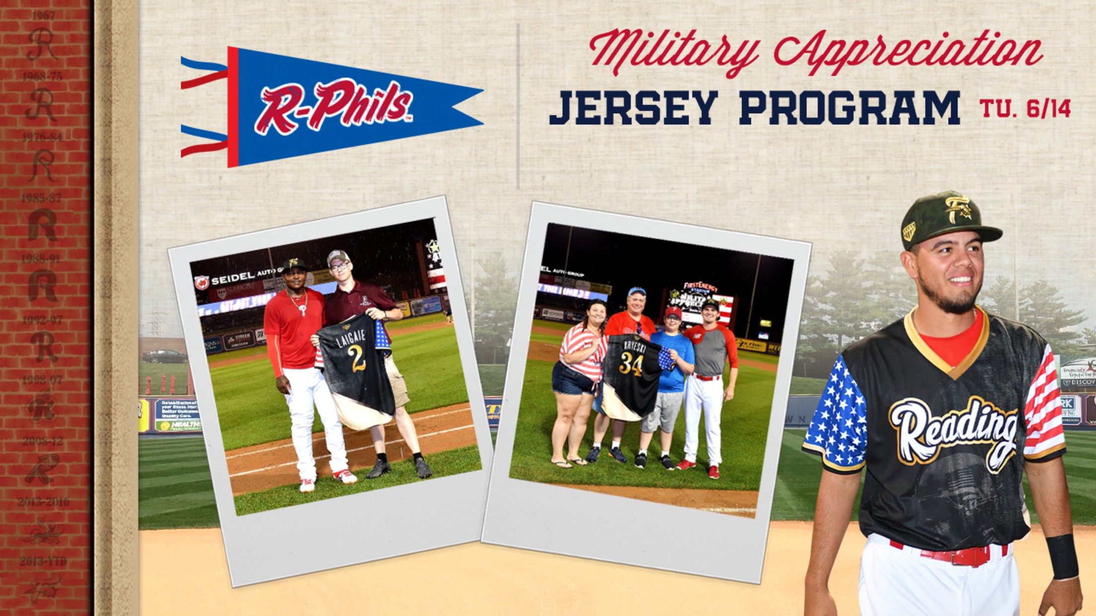 (Reading, PA) – The Reading Fightin Phils will salute the men and women who have fought for our country and freedom. On Tuesday, June 14th the R-Phils will celebrate Military Appreciation Night at America’s Classic Ballpark when the team takes on the Portland Sea Dogs (Red Sox) at 7:00pm. Fans can have the opportunity to honor a special military member in their life by reserving a group outing to receive a personalized game-worn jersey. Plus, be one of the first to enter the gate to get a unique R-Phils giveaway celebrating Flag Day!