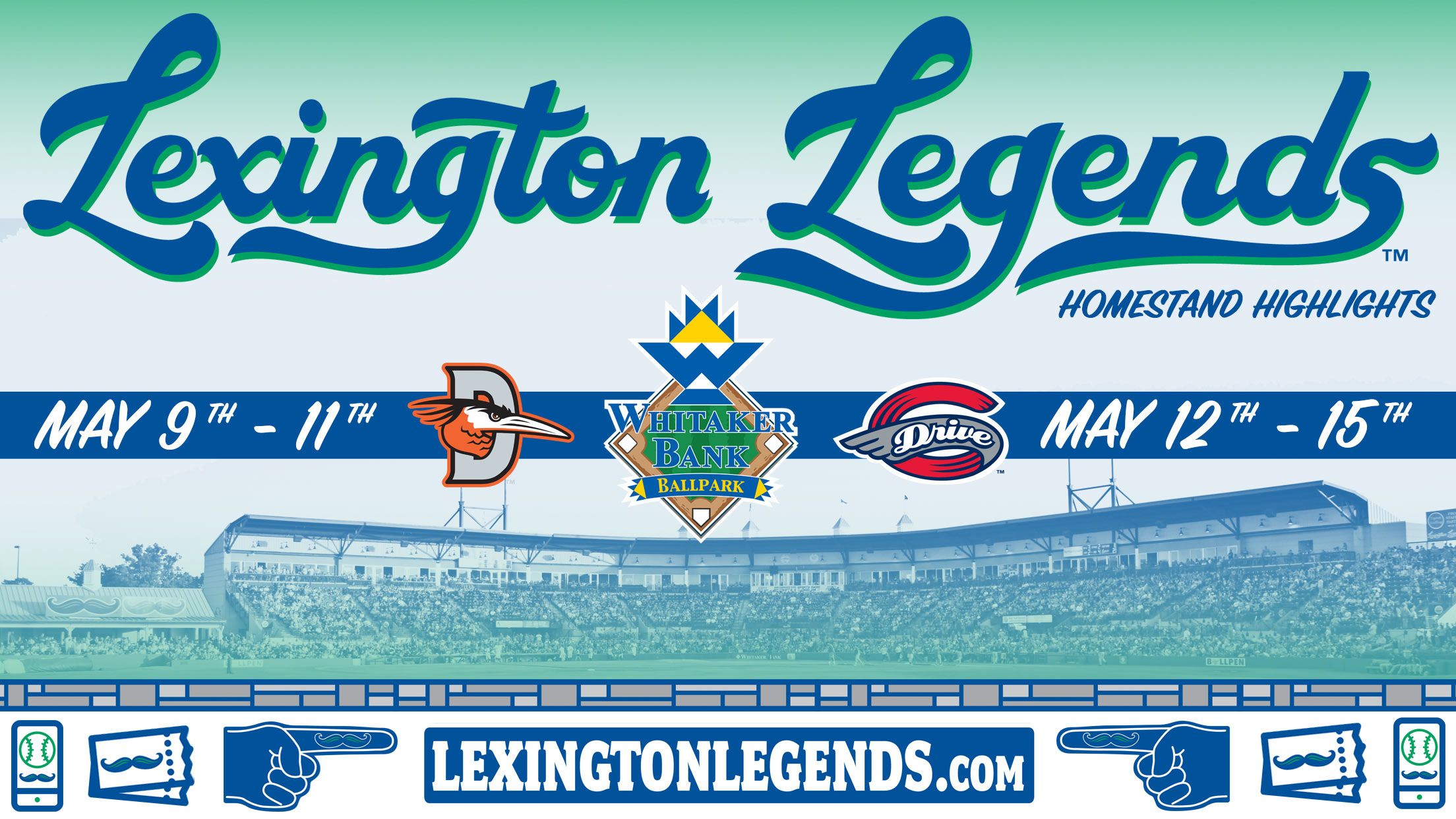 WHITAKER BANK BALLPARK (Lexington, KY) - The Lexington Legends return to Whitaker Bank Ballpark after the longest road trip of the season thus far on May 9. The Legends will first face the Delmarva Shorebirds in a three-game series, then welcome in the Greenville Drive for four games. The home