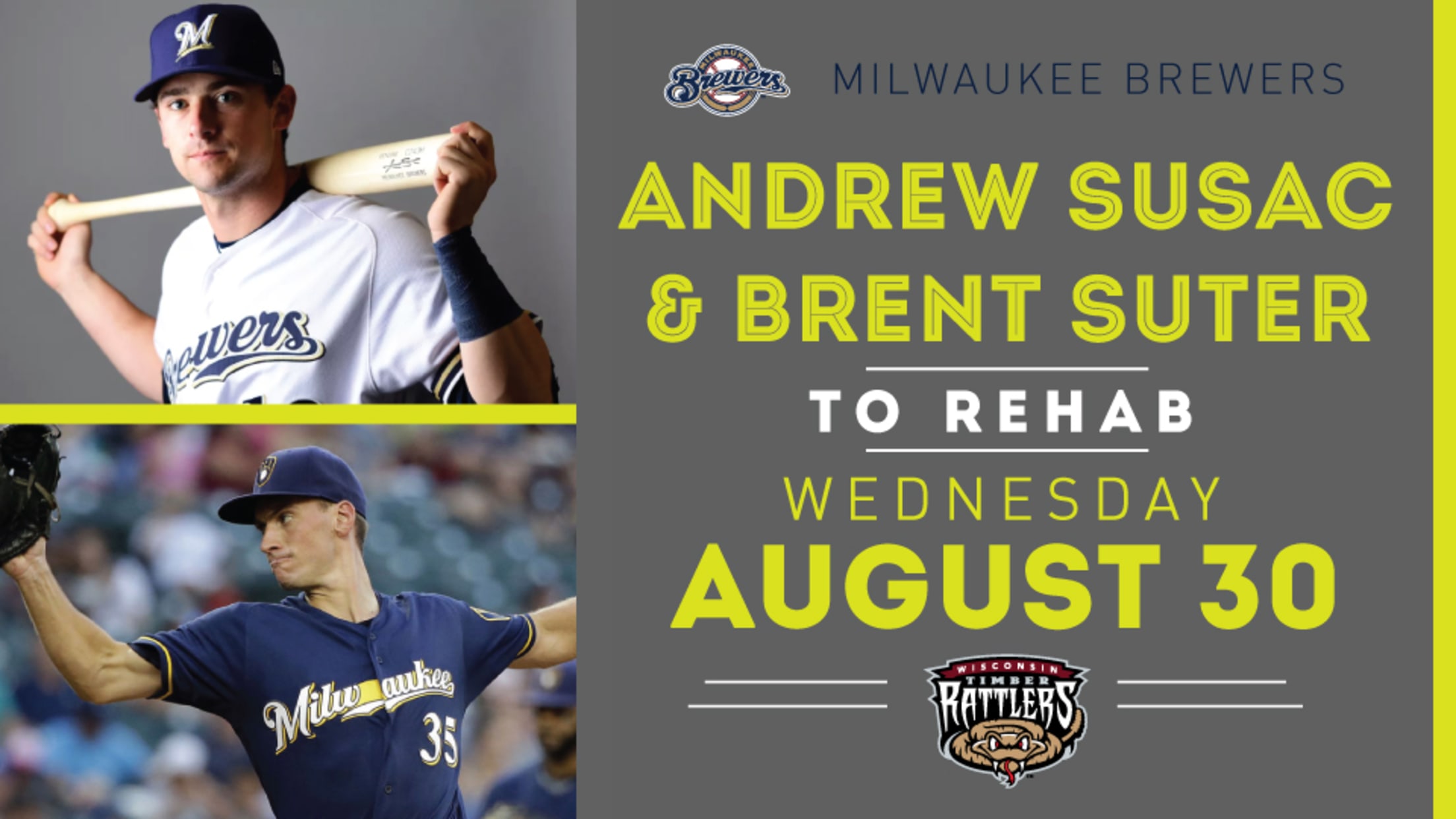 GRAND CHUTE, WI - The Milwaukee Brewers have announced that Brent Suter and Andrew Susac will make rehabilitation appearances with the Wisconsin Timber Rattlers during Wisconsin's homestand against the Beloit Snappers that starts on Wednesday, August 29. First pitch on Wednesday night is scheduled for 7:05pm.