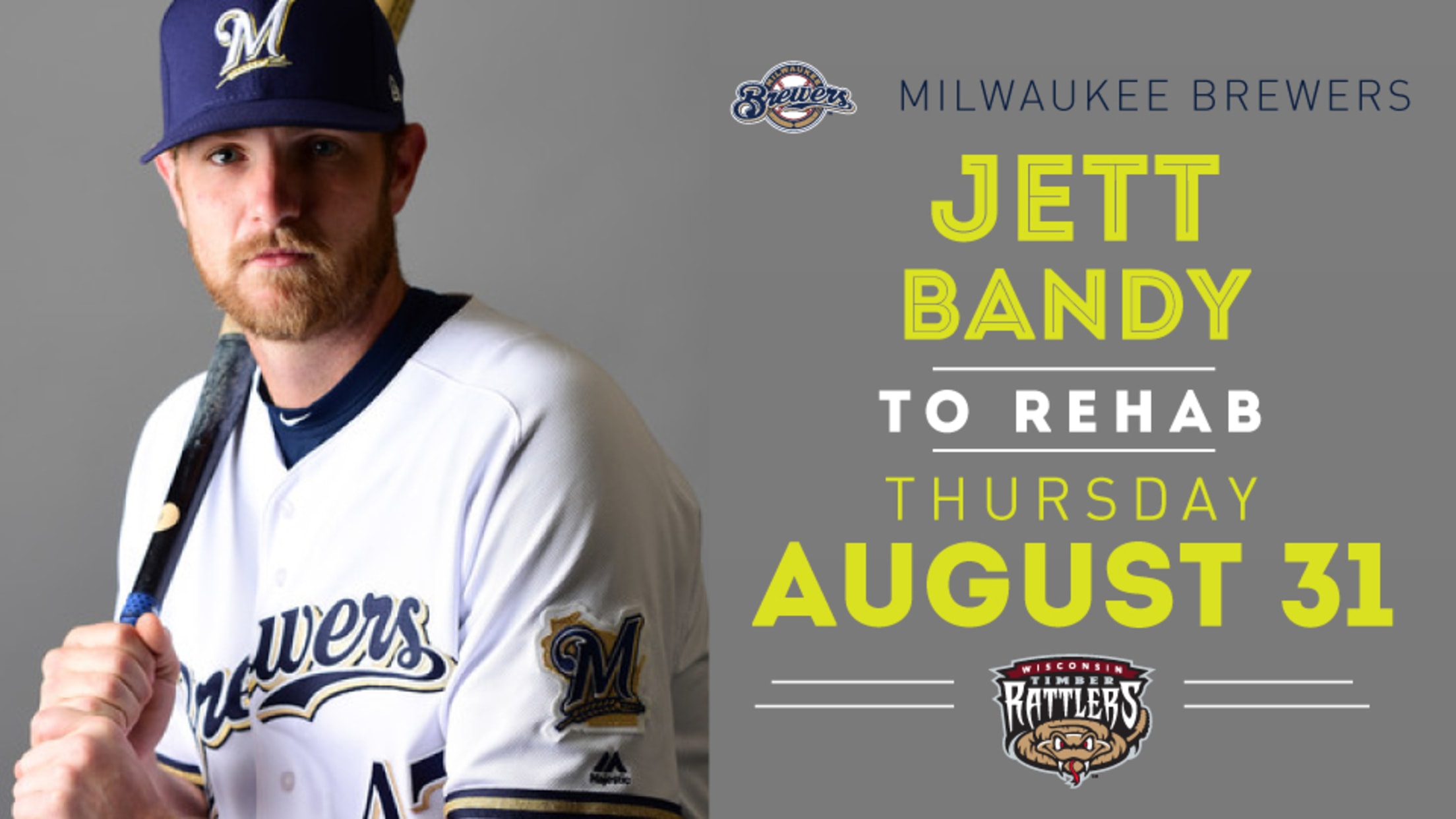 GRAND CHUTE, WI - The Milwaukee Brewers have announced that Jett Bandy will begin a rehabilitation assignment with the Wisconsin Timber Rattlers on Thursday, August 31. First pitch against the Beloit Snappers is scheduled for 7:05pm.