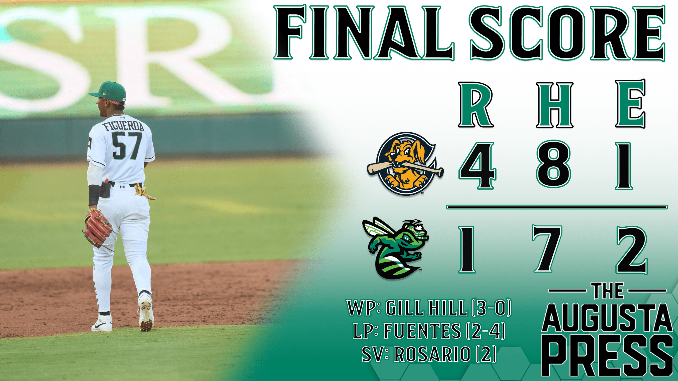 On paper, the matchup previewed as a pitchers’ duel between Gary Gill Hill of Charleston and Didier Fuentes of Augusta, and through 3 innings that proved the case. Fuentes retired the first 8 batters he faced and worked around a two-out walk and single in the 3rd to extend his scoreless streak to 14 innings. Gill Hill was far from perfect, especially in the 2nd, as the GreenJackets used two singles and a walk to load the bases with one out. Gill Hill doubled down, forcing Lieker Figueroa and Isaiah Drake to pop up and keep the game scoreless.