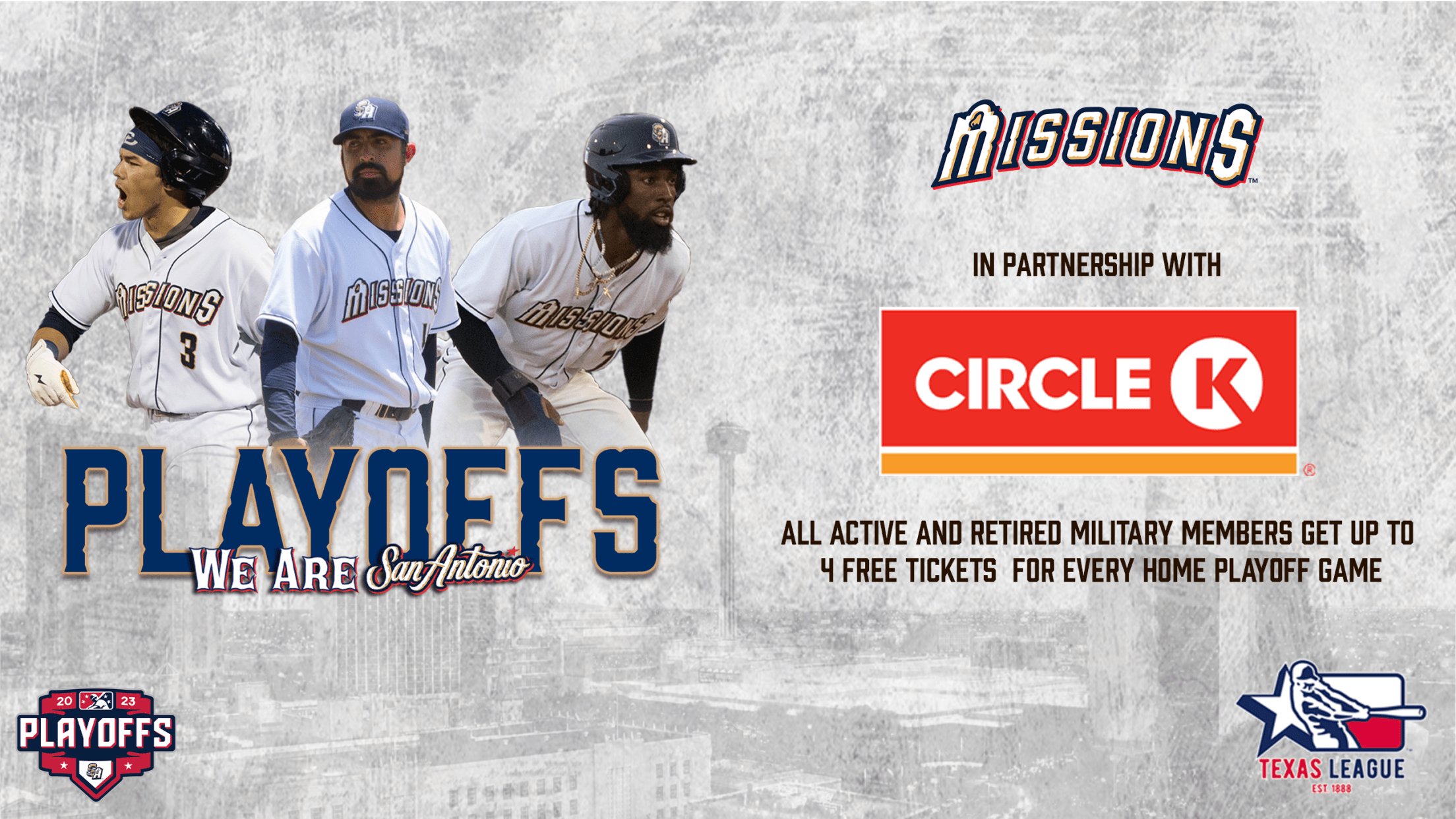 Texas League Playoffs Begin September 19th SAN ANTONIO – The San Antonio Missions Baseball Club and Circle K are partnering for the 2023 Texas League Postseason. This partnership will honor all active and retired military members during Missions home games in the postseason. All active and retired members of the