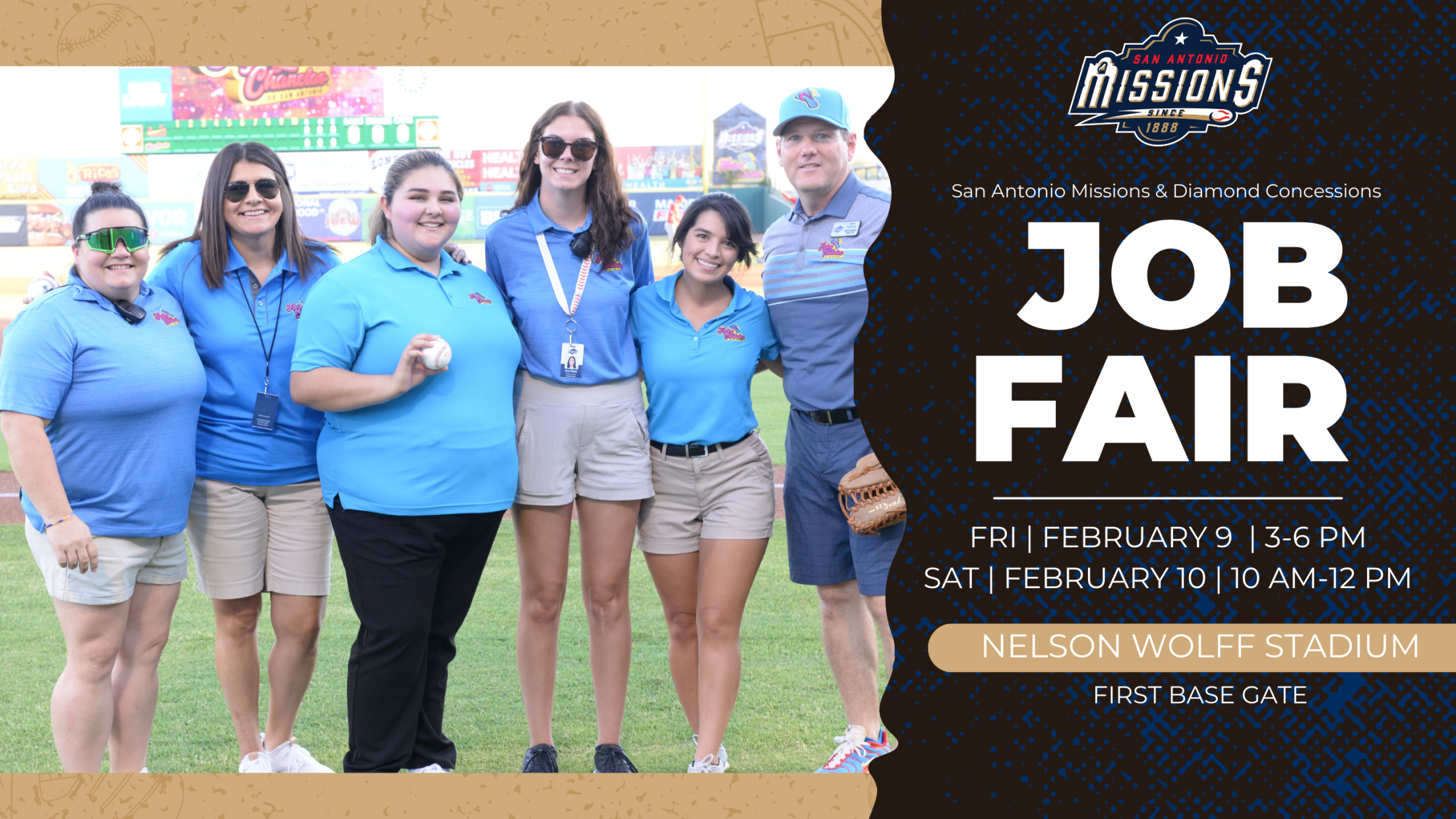 SAN ANTONIO – The San Antonio Missions and Diamond Concessions, the food service provider for the Missions, will be hosting a job fair on Friday, February 9th and Saturday, February 10th. The job fair is currently scheduled for 3:00 p.m. to 6:00 p.m. on Friday and 10:00 a.m. to 12:00 p.m. on Saturday. The job fair will take place at Nelson Wolff Stadium.