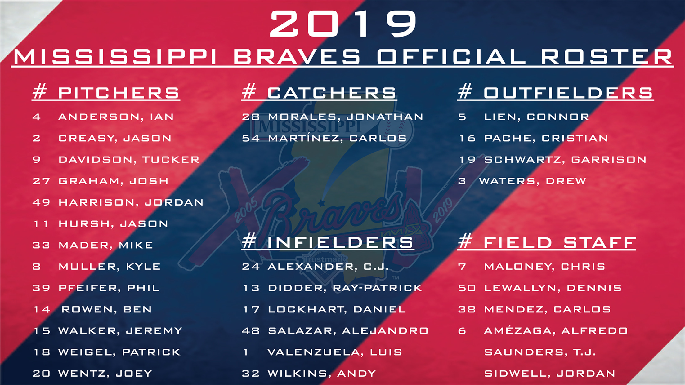 Overall the initial roster has 14 players returning to Mississippi from 2018, 13 that were drafted by the Braves, four minor league free agents, four non-drafted free agents, three acquired via trade and one selected in the Rule 5 draft. The roster contains two with MLB experience (Hursh, Wilkins), seven countries represented (United States, Dominican Republic, Venezuela, Aruba, Columbia, Mexico and the U.S. territory of Puerto Rico), nine top 30 prospects according to MLB.com (Anderson (3), Pache (4), Waters (8), Wentz (12), Muller (13), Weigel (19), Davidson (22), Alexander (23) and Didder (30), and three top 100 prospects in baseball according to MLB.com (Anderson (32), Pache (36) and Waters (84)).
