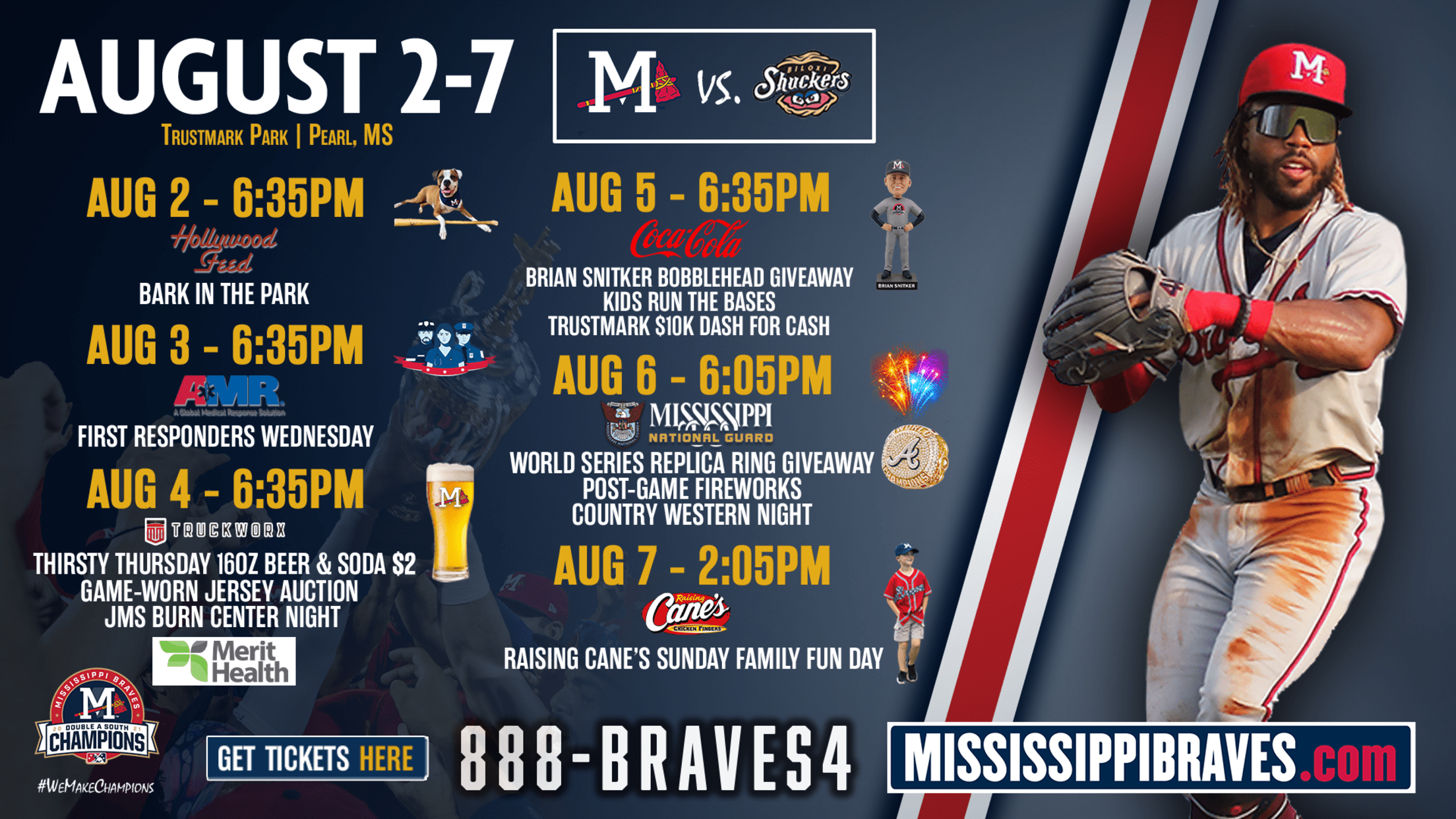 PEARL, MS – The Mississippi Braves begin a six-game series against the Biloxi Shuckers (Double-A Affiliate, Milwaukee Brewers) at Trustmark Park. Each night, the homestand features great promotions, including JMS Burn & Reconstructive Center Night on Thursday, a Brian Snitker Bobblehead Giveaway on Friday and a World Series Replica Ring Giveaway on Saturday!