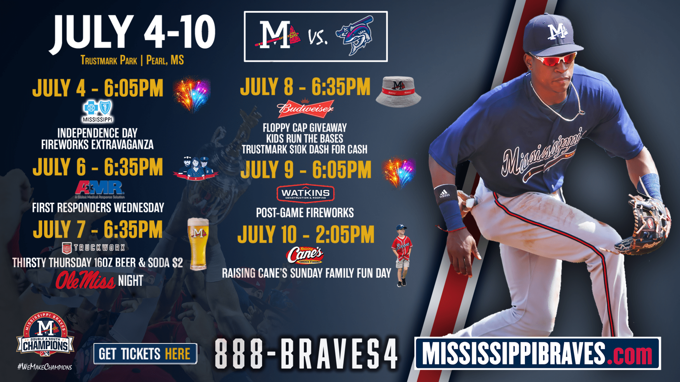- Independence Day Fireworks Extravaganza: Join us for July 4th, as the M-Braves and the city of Pearl celebrate Independence Day with a Post-Game Fireworks Extravaganza, presented by Blue Cross Blue Shield of Mississippi!