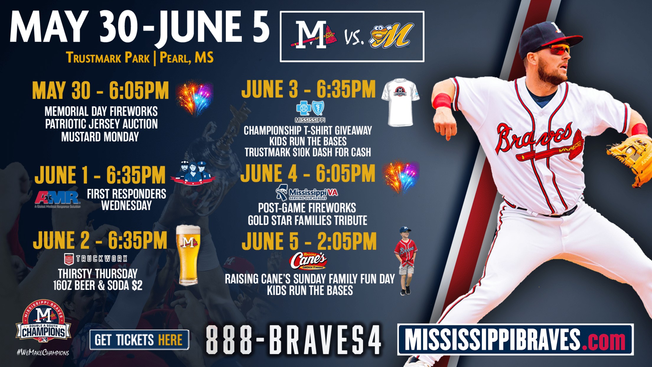 PEARL, MS – The Mississippi Braves begin a six-game series on Tuesday against the Montgomery Biscuits (Double-A Affiliate, Tampa Bay Rays) at Trustmark Park. Each night, the homestand features great promotions, including Memorial Day flyover & fireworks and a championship t-shirt giveaway on Friday! Monday, May 30 | vs. Montgomery