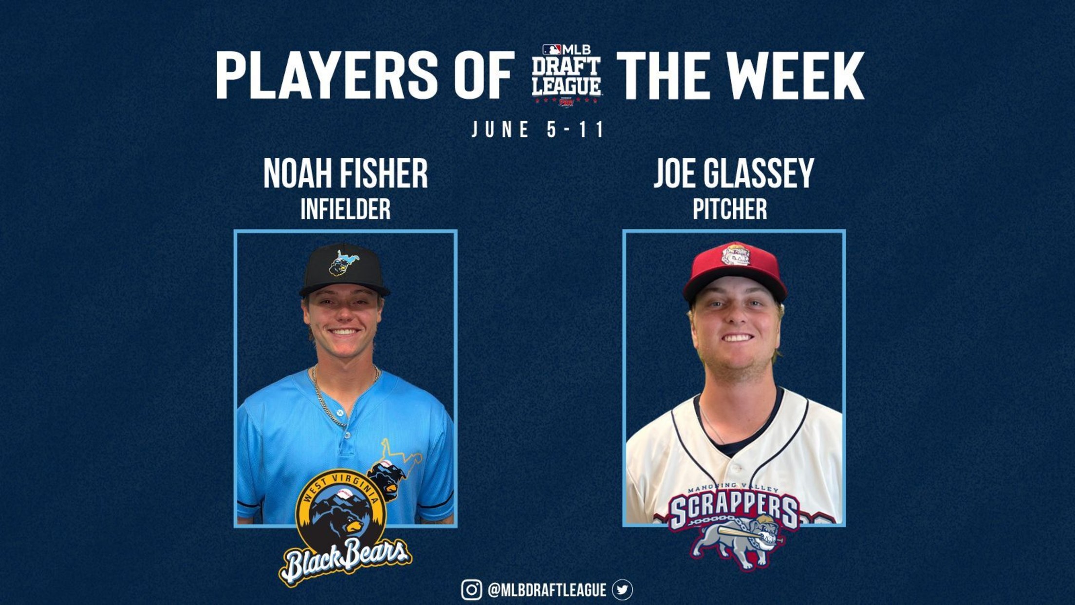 NEW YORK -- The MLB Draft League announced that West Virginia’s Noah Fisher and Mahoning Valley’s Joe Glassey were named Hitter and Pitcher of the Week, respectively, for the period of June 5 to June 11.