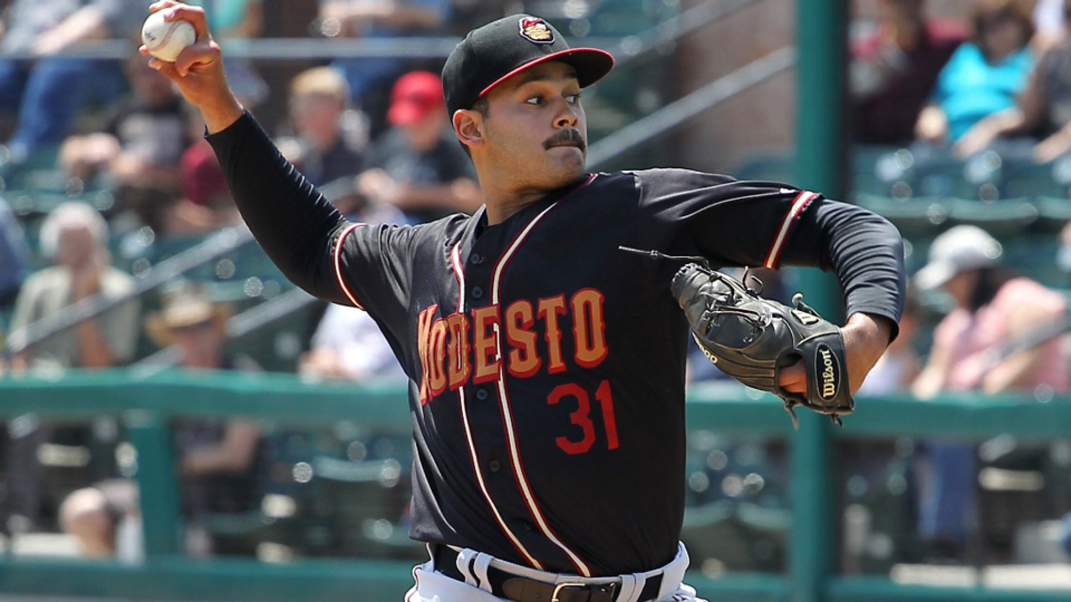 The Mariners' 23rd-ranked prospect gave up three hits over seven innings, retiring 19 batters in a row in one stretch, in his first scoreless appearance of the season as Class A Advanced Modesto walked off with a 2-1, 10-inning victory over Visalia on Tuesday at John Thurman Field.