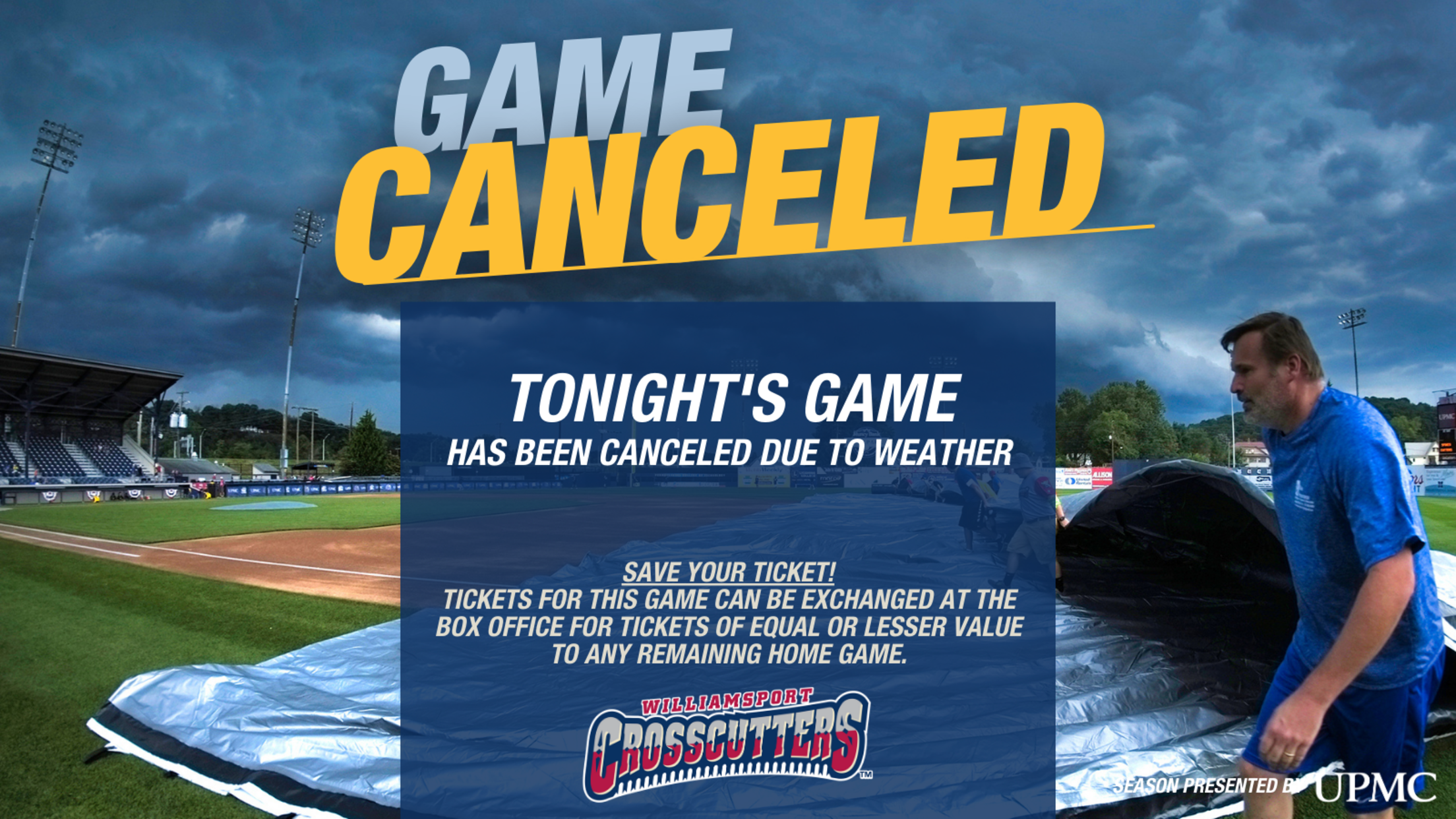 The Williamsport Crosscutters game scheduled for June 12 vs. West Virginia Black Bears has been canceled due to rain & field conditions. The game will not be made up.