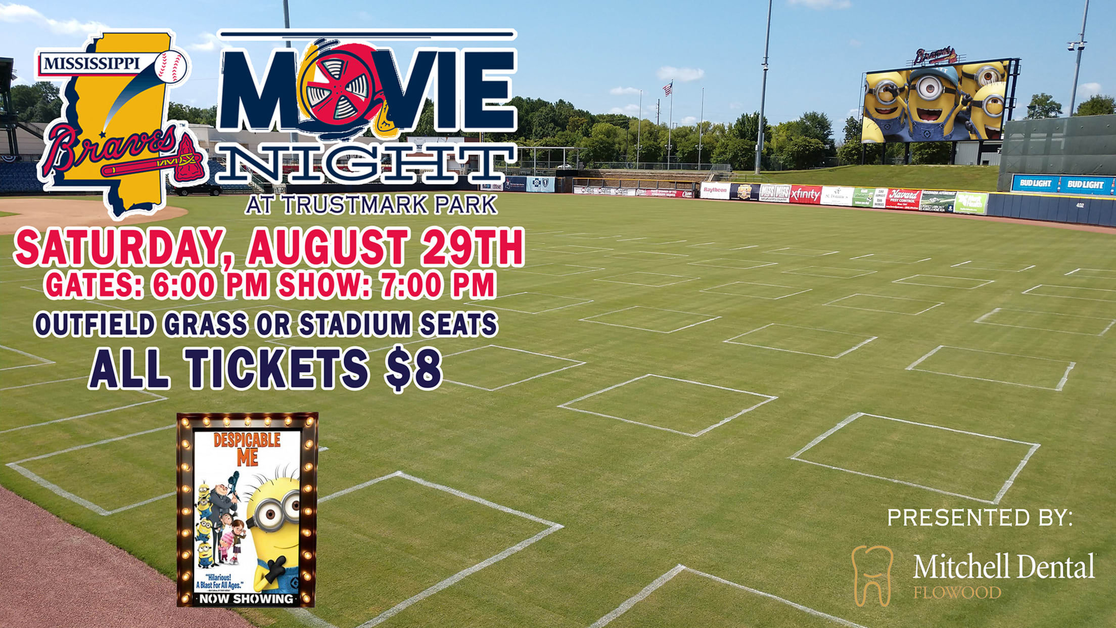 PEARL - The Mississippi Braves will host a Movie Night at Trustmark Park on Saturday, August 29, presented by Mitchell Dental Clinic. The movie begins at 7:00 pm and gates open at 6:00 pm. The featured film will be the 2010 animated comedy, Despicable Me.