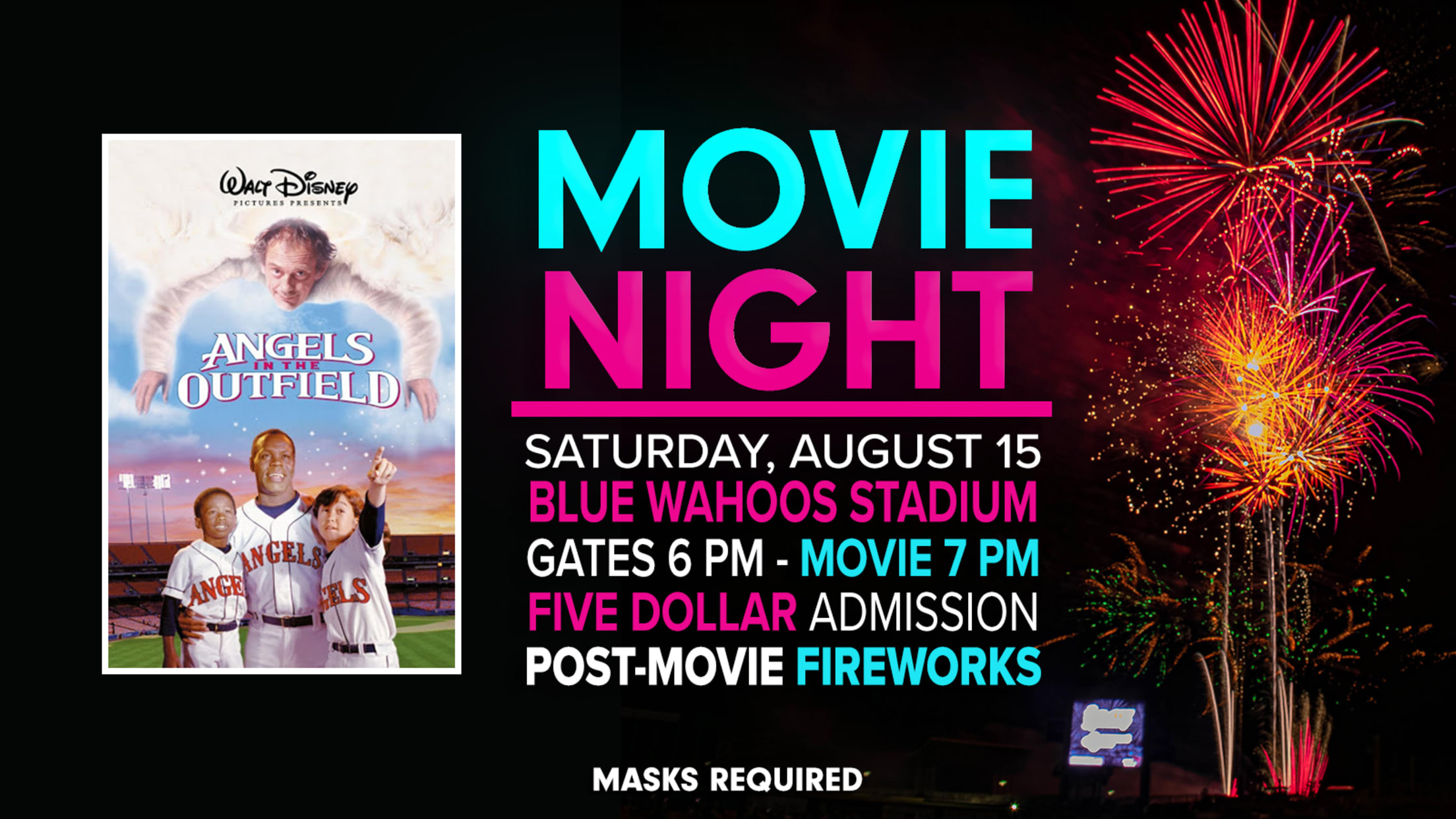 The Summer Movie Series at Blue Wahoos Stadium continues on Saturday, August 15th at 7:00 PM with a special showing of Angels in the Outfield! Tickets are just $5 per person and include both the movie and a fireworks show! Children (12 and under), military members, and seniors (65+) receive