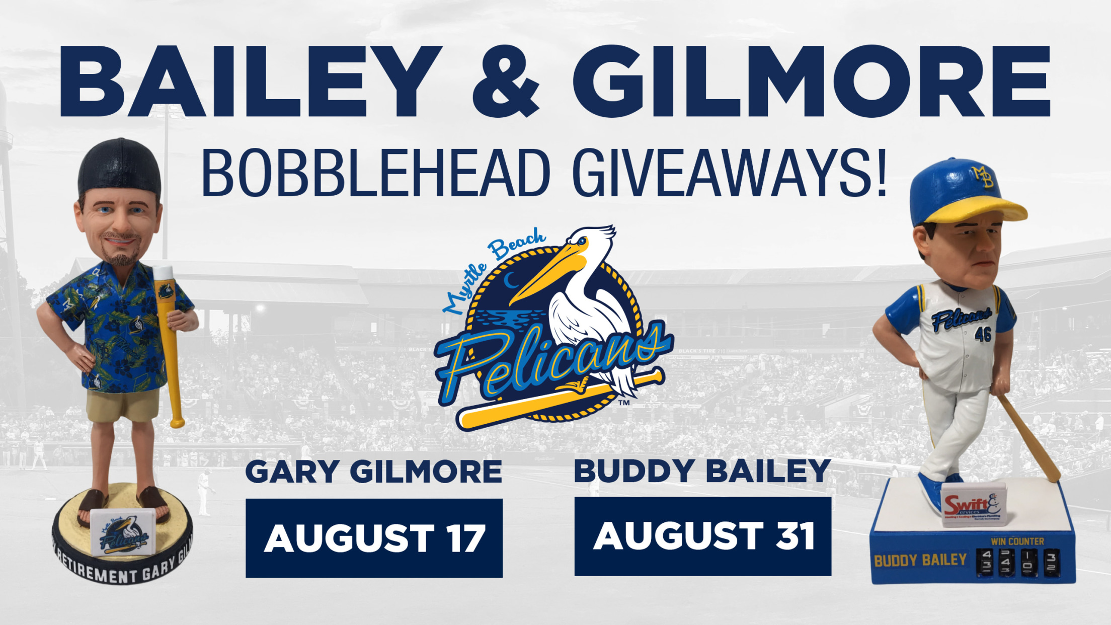 Today the Myrtle Beach Pelicans unveiled the two mystery bobbleheads listed on their 2024 promotional schedule. The first, scheduled for Saturday, August 17, will feature former Coastal Carolina University baseball coach Gary Gilmore. The second, scheduled for Saturday, August 31, will feature the Birds’ current manager, Buddy Bailey. Each night the first 1,000 fans through the gates will receive a bobblehead.