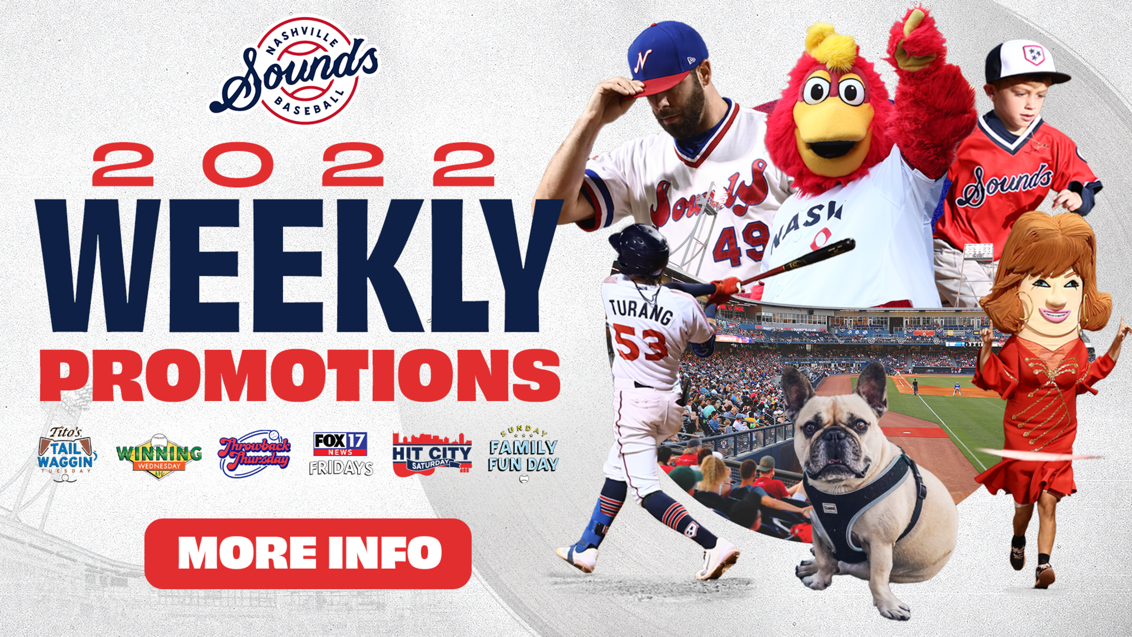 Other weekly promotions throughout the 2022 season include Winning Wednesdays presented by Pepsi, Kroger Wednesdays, Throwback Thursdays presented by Budweiser, FOX 17 News Fridays, Hit City Saturdays and Sunday Family Fun Days.