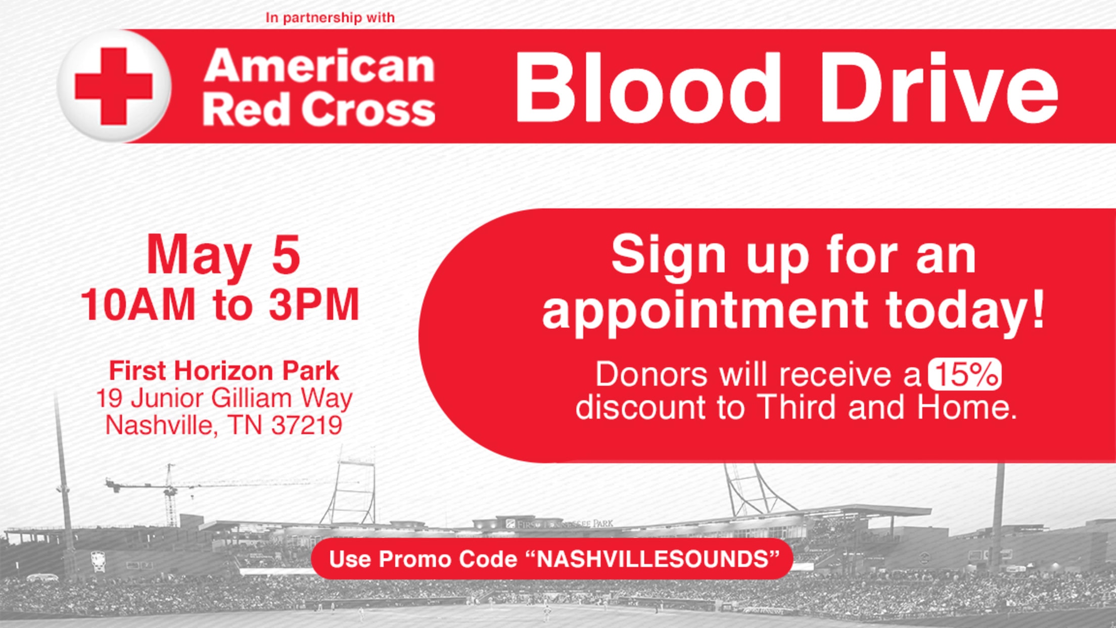 The Nashville Sounds Baseball Club announced today it has partnered with the American Red Cross to host a blood drive at First Horizon Park on Wednesday, May 5.
