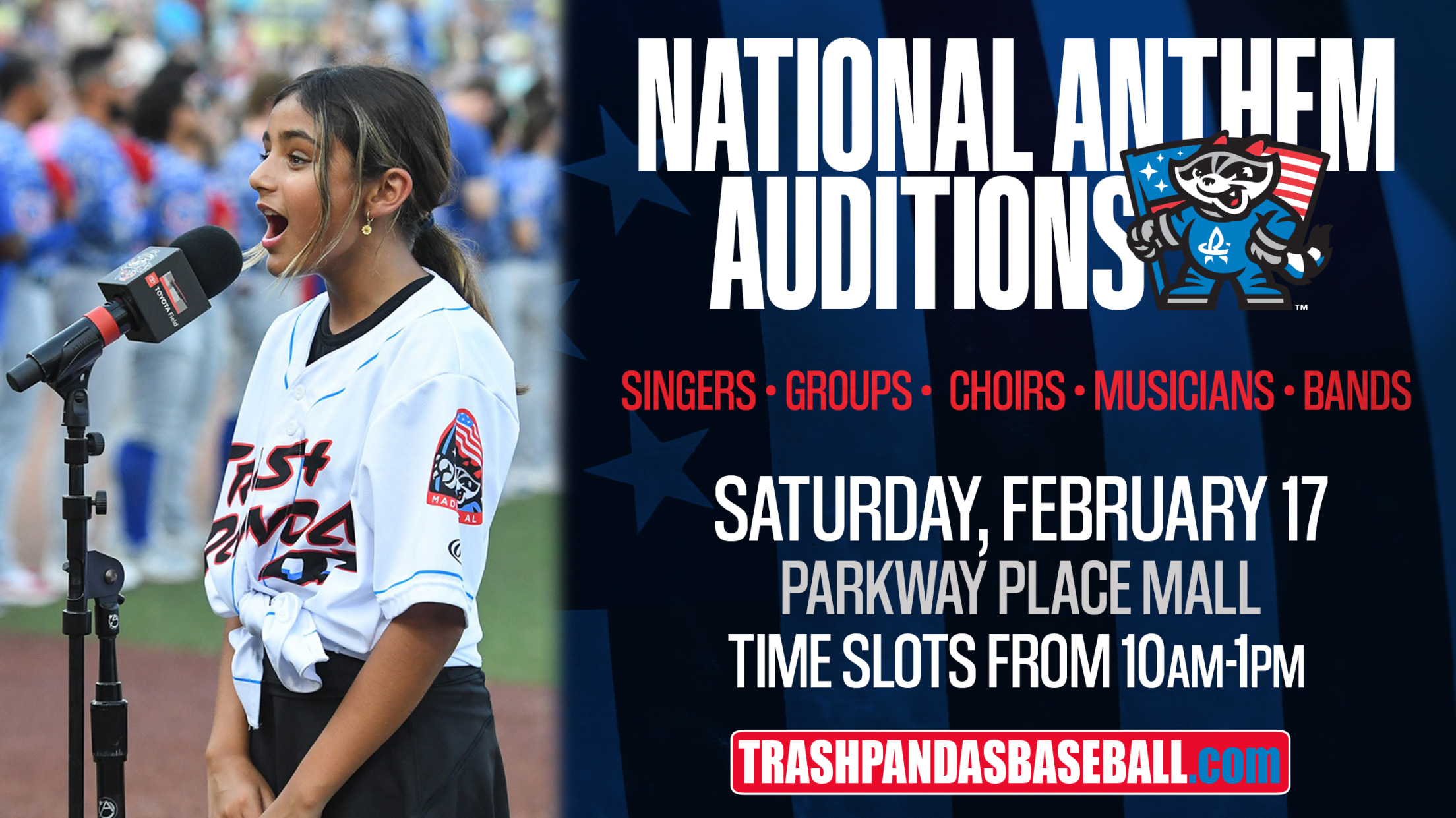 MADISON, Alabama – The Rocket City Trash Pandas will host National Anthem Auditions at the Parkway Place Mall on Saturday, February 17 from 10 a.m. to 1 p.m. Individuals and ensemble groups and choirs are invited to audition for the opportunity to sing the “Star Spangled Banner” prior to one