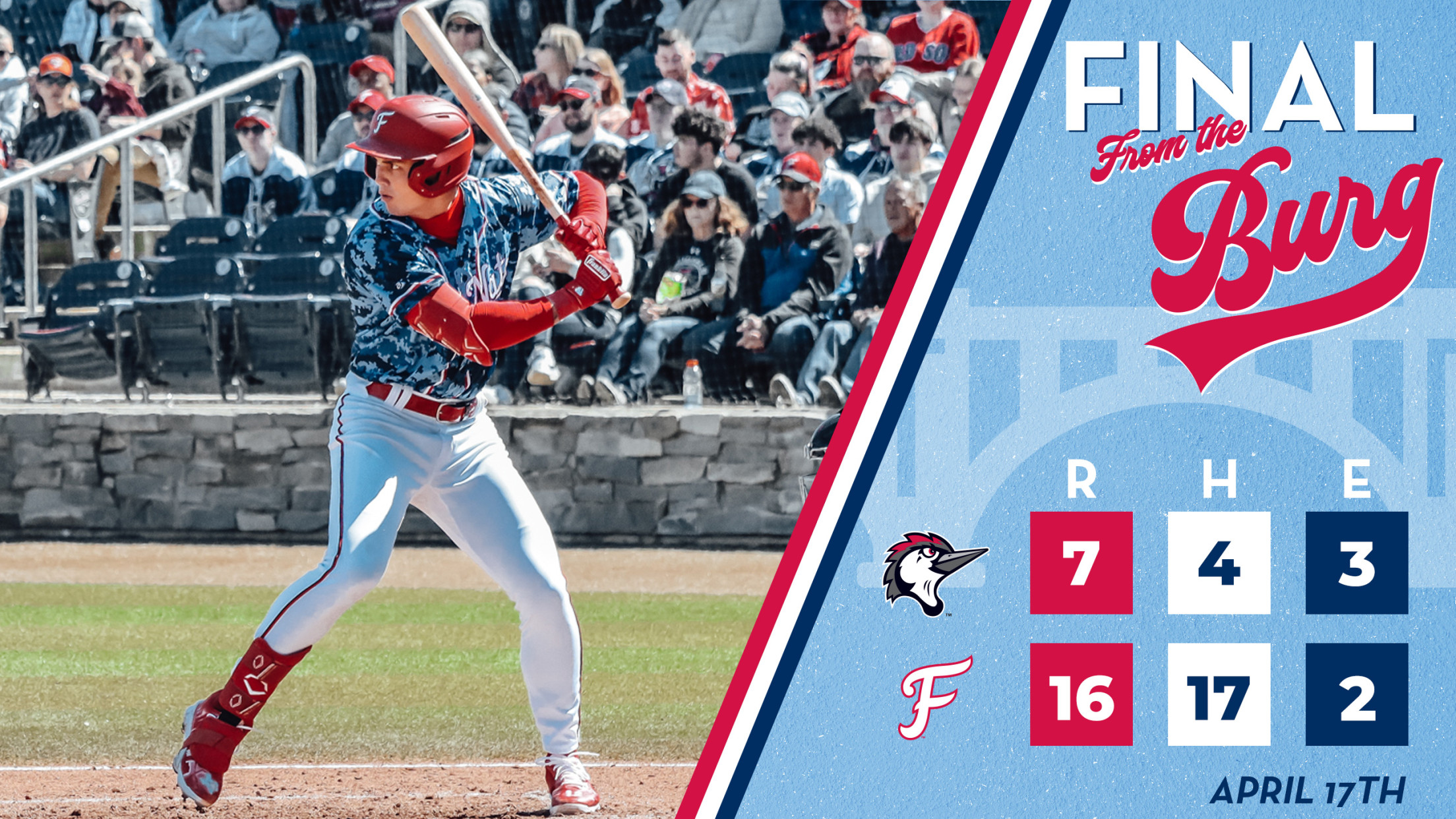 FREDERICKSBURG, VA - A day after being shutout, the FredNats erupted for 16 runs on 17 hits in a 16-7 victory over the Fayetteville Woodpeckers.