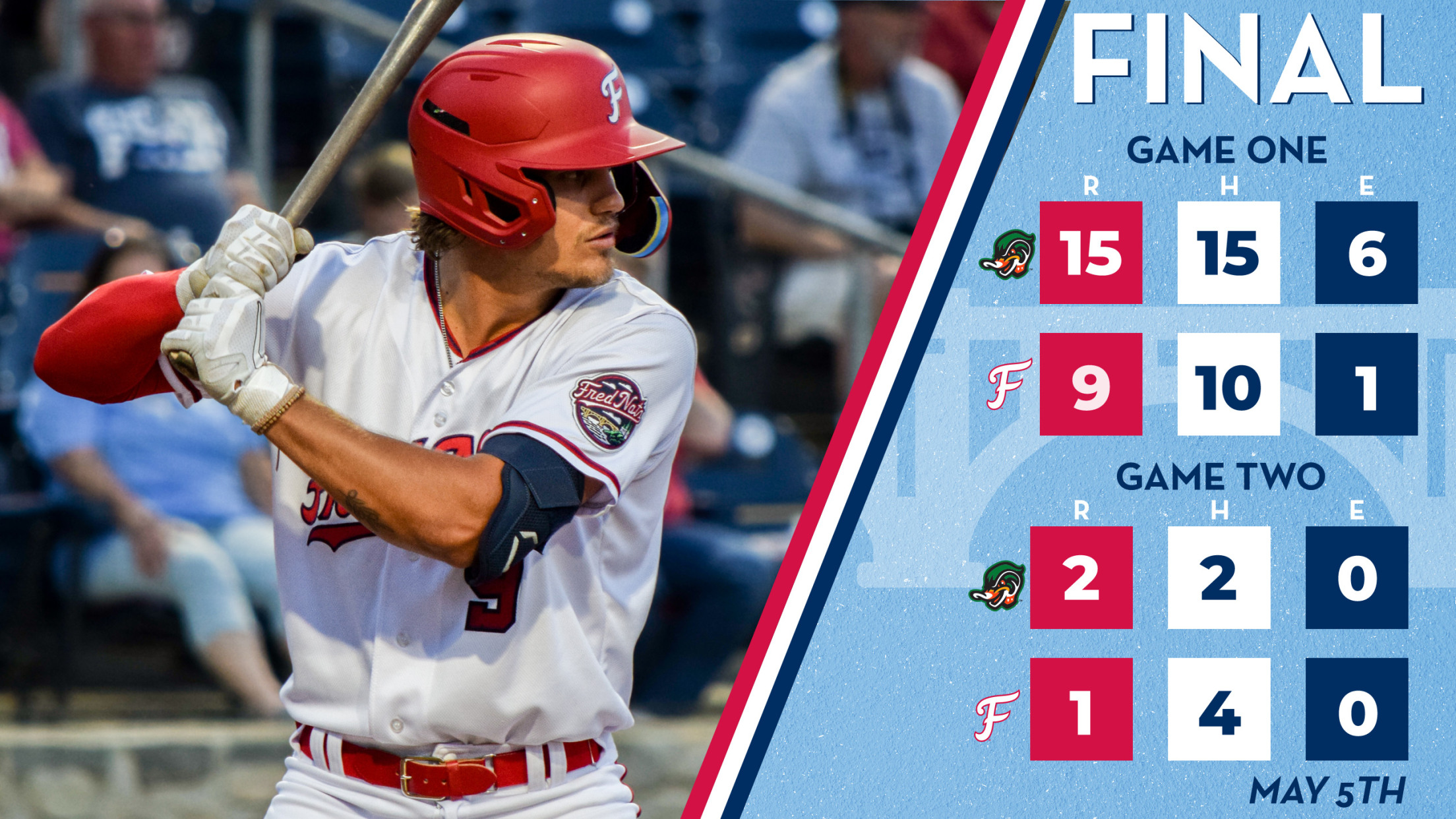 FREDERICKSBURG, VA - The Fredericksburg Nationals dropped both games in a double header against the Down East Wood Ducks on a Friday evening. Game one, which was the resumption of a suspended game from Thursday, May 4th, began with the bases loaded and nobody out in the top of the