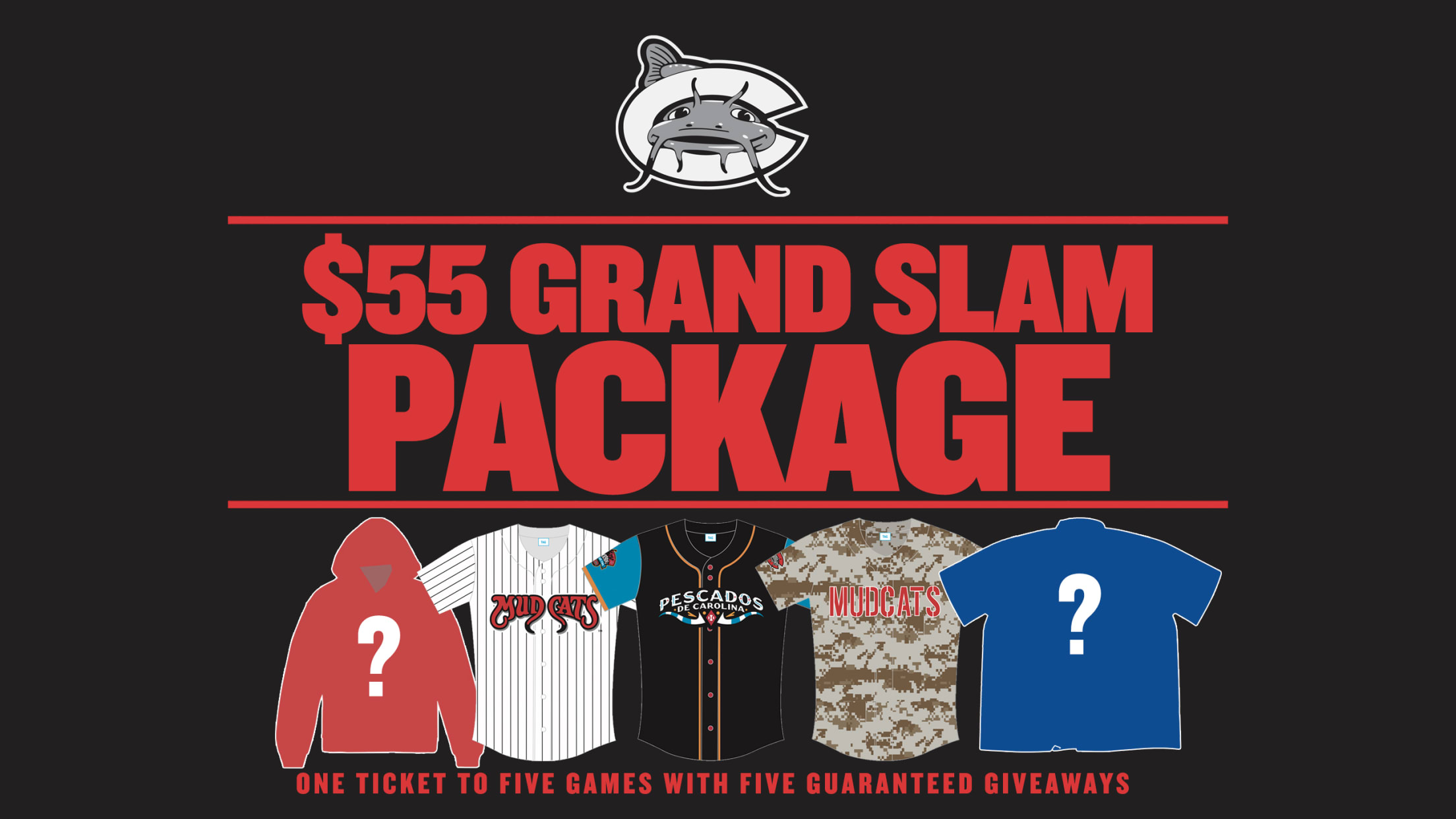 The Grand Slam ticket plan starts at $55 and includes one box seat ticket to five pre-selected souvenir giveaway night games at Five County Stadium. This new ticket deal also features Carolina's "giveaway guarantee" as plan holders are guaranteed to receive a souvenir giveaway item from each game included in the ticket plan. Those items will include a long sleeved Mudcats performance hoodie, a Pescados de Carolina replica jersey, a Micro Brews themed Hawaiian shirt, a pinstriped throwback Mudcats replica jersey and a military themed replica Mudcats jersey.