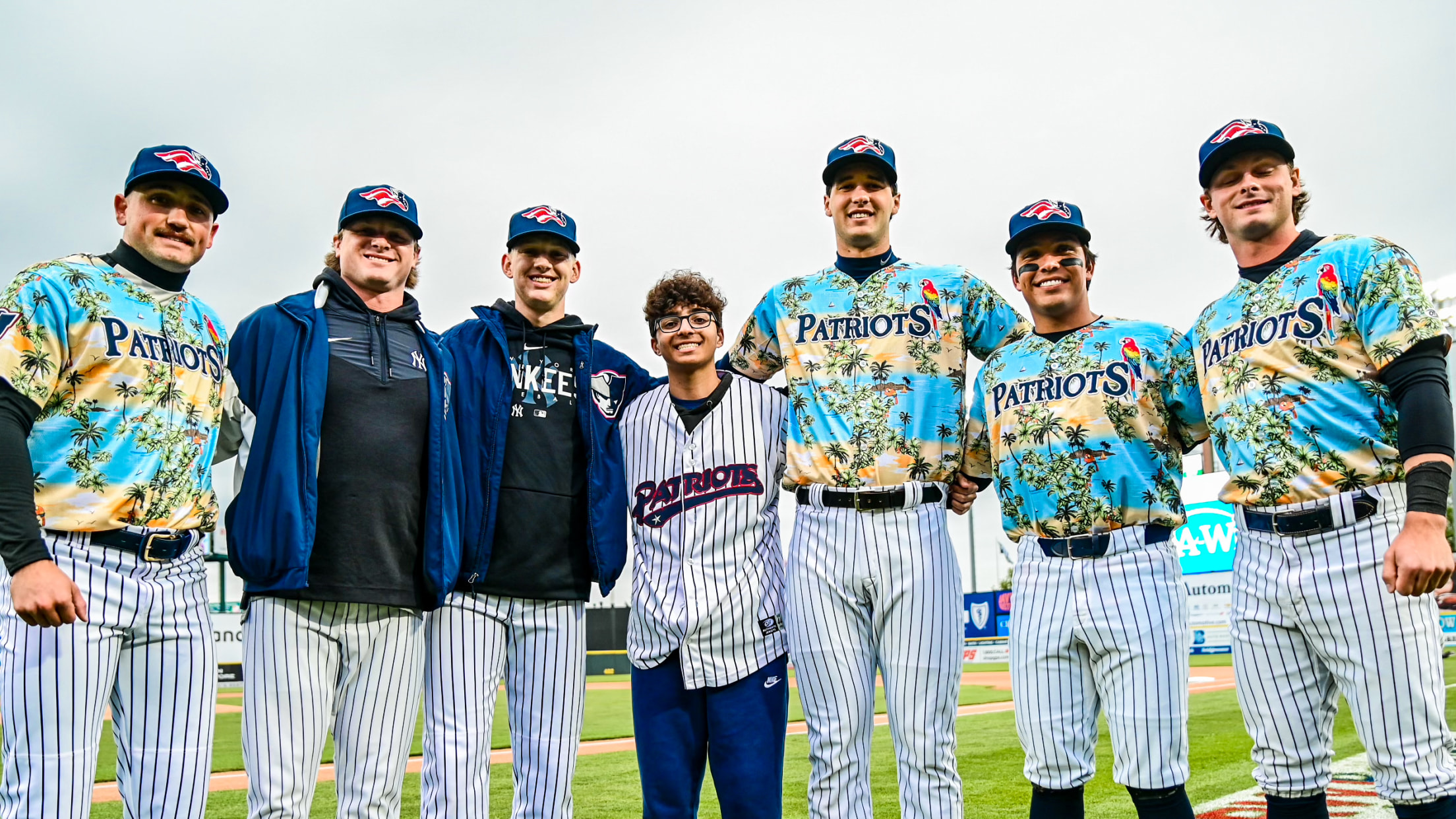 Following the announcement, Patriots players, led by the Yankees top MiLB prospect Spencer Jones, gave Huber a personalized Patriots home jersey and posed for pictures.