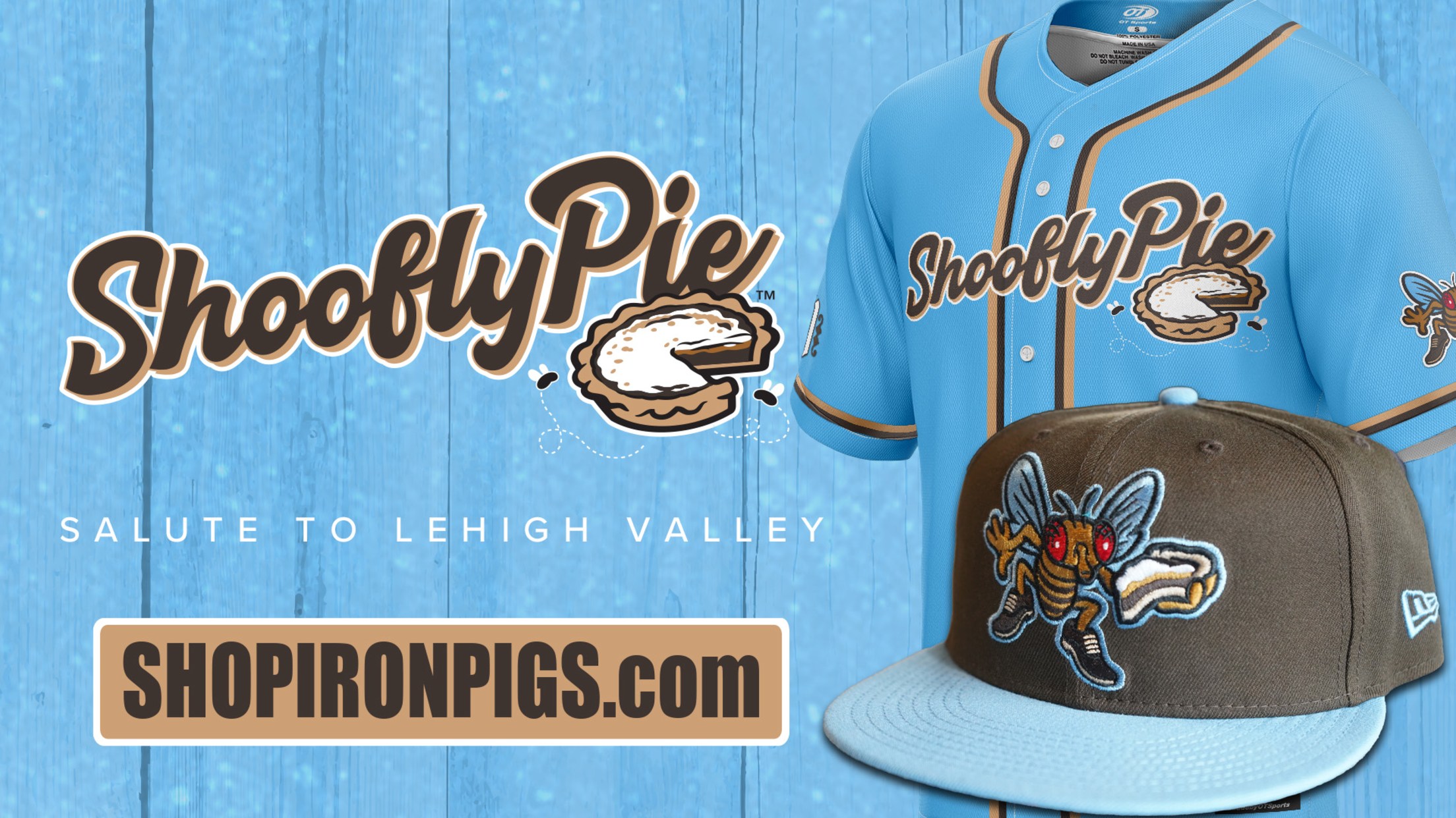 The IronPigs jersey and logo treatment of Shoofly Pie anthropomorphizes the fly in the name, making the insect the primary logo on the hat. The fly holds a piece of a pie while hovering and is reminiscent of the same color of the pie itself. The actual jersey is a light blue (similar to the accent color found in the IronPigs Hex apparel) with piping of light and dark brown, representing the colors of Shoofly Pie. Adoring the Shoofly Pie wordmark is the pie itself (with the missing piece being the one the fly on the cap is holding) with two smaller flies encircling the pie. Following the game on July 13, the Shoofly Pie Jerseys will be auctioned off while the hats will be entered into a raffle. Auction and raffle proceeds with benefit both IronPigs Charities and RBI Lehigh Valley.