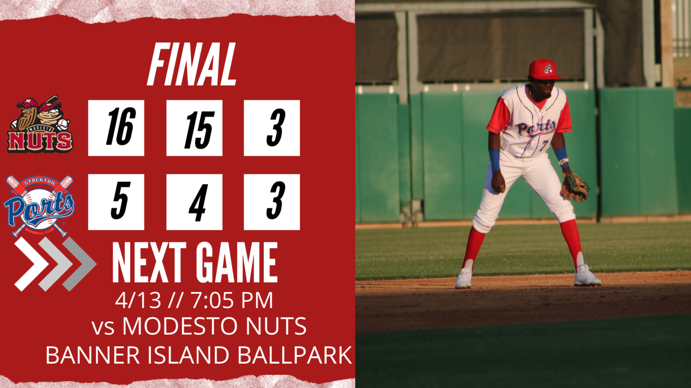 STOCKTON, Ca. – The Modesto Nuts pounded out 15 hits and struck out 21 Ports as Stockton fell in its home opener by the final of 16-5 on Tuesday night at Banner Island Ballpark.